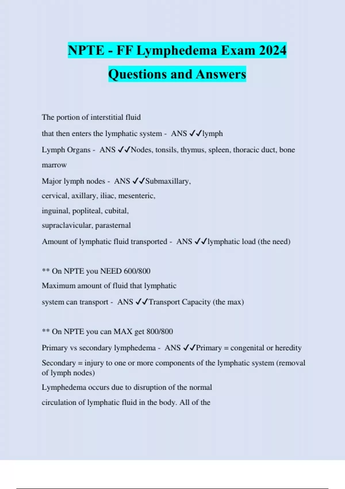 NPTE - FF Lymphedema Exam 2024 Questions and Answers The portion of interstitial fluid that then enters the lymphatic system - ANS ️️ lymph Lymph Organs - ANS ️️ Nodes, tonsils, thymus, spleen, thoracic duct, bone marrow Major lymph nodes - ANS ️️ Submaxillary, cervical, axillary, iliac, mesenteric, inguinal, popliteal, cubital, supraclavicular, parasternal Amount of lymphatic fluid transported - ANS ️️ lymphatic load (the need) ** On NPTE you NEED 600/800 Maximum amount of fluid that lymphatic system can transport - ANS ️️ Transport Capacity (the max) ** On NPTE you can MAX get 800/800 Primary vs secondary lymphedema - ANS ️️ Primary = congenital or heredity Secondary = injury to one or more components of the lymphatic system (removal of lymph nodes) Lymphedema occurs due to disruption of the normal circulation of lymphatic fluid in the body. All of the following are causes of secondary lymphedema EXCEPT: A. Infection by Wuchereria Bancroffti B. Kaposi's sarcoma C. Traumatic injuries D. Milroy's disease - ANS ️️ D Milroys is Primary Pitting Edema - ANS ️️ Pressure on the edematous tissues with the fingertips causes an indentation of the skin that persists for several seconds after the pressure is removed. This reflects significant but short duration edema with little or no fibrotic changes in skin or subcutaneous ti