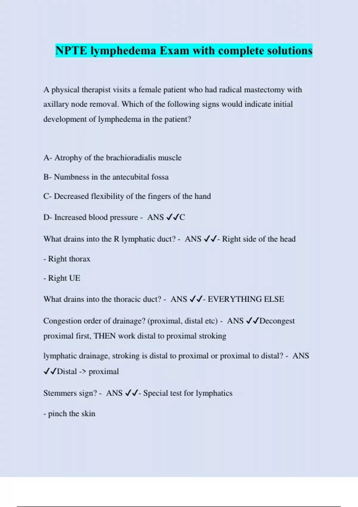 NPTE lymphedema Exam with complete solutions A physical therapist visits a female patient who had radical mastectomy with axillary node removal. Which of the following signs would indicate initial development of lymphedema in the patient? A- Atrophy of the brachioradialis muscle B- Numbness in the antecubital fossa C- Decreased flexibility of the fingers of the hand D- Increased blood pressure - ANS ️️ C What drains into the R lymphatic duct? - ANS ️️ - Right side of the head - Right thorax - Right UE What drains into the thoracic duct? - ANS ️️ - EVERYTHING ELSE Congestion order of drainage? (proximal, distal etc) - ANS ️️ Decongest proximal first, THEN work distal to proximal stroking lymphatic drainage, stroking is distal to proximal or proximal to distal? - ANS ️️ Distal -> proximal Stemmers sign? - ANS ️️ - Special test for lymphatics - pinch the skin