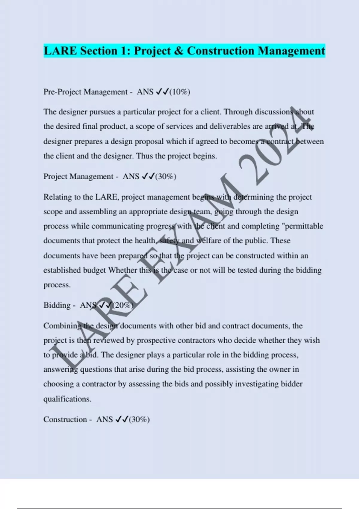 LARE Section 1: Project & Construction Management Pre-Project Management - ANS ️️ (10%) The designer pursues a particular project for a client. Through discussions about the desired final product, a scope of services and deliverables are arrived at. The designer prepares a design proposal which if agreed to becomes a contract between the client and the designer. Thus the project begins. Project Management - ANS ️️ (30%) Relating to the LARE, project management begins with determining the project scope and assembling an appropriate design team, going through the design process while communicating progress with the client and completing "permittable documents that protect the health, safety and welfare of the public. These documents have been prepared so that the project can be constructed within an established budget Whether this is the case or not will be tested during the bidding process. Bidding - ANS ️️ (20%) Combining the design documents with other bid and contract documents, the project is then reviewed by prospective contractors who decide whether they wish to provide a bid. The designer plays a particular role in the bidding process, answering questions that arise during the bid process, assisting the owner in choosing a contractor by assessing the bids and possibly investigating bidder qualifications. Construction - ANS ️️ (30%) Like in bidding, the designer plays a particular role during construction. Usually not related to the physical execution of the design documents, but participating in meetings with the owner and contractor, providing clarifications to documentation questions, reviewing construction progress that the installation is proceeding as designed and providing substantial completion and punch list services once the contractor declares the completion of construction. Maintenance - ANS ️️ (10%) The designer's participation in the project may not end with construction. At times, the designer may be asked to prepare maintenance and operation manuals, prepare a management plan and review maintenance services. Components of Pre-Project Management (7) - ANS ️️ -Preparation of or response to a Request for Qualification (RFQ) or Request for Proposal (RFP) -Determine project scope and client requirements -Develop design program -Establish Scope of Services and required outside expertise (selecting a team of project consultants) -Establish project budget -Prepare and negotiate contractual agreements with the client -Establish project schedule Client - ANS ️️ A person usin