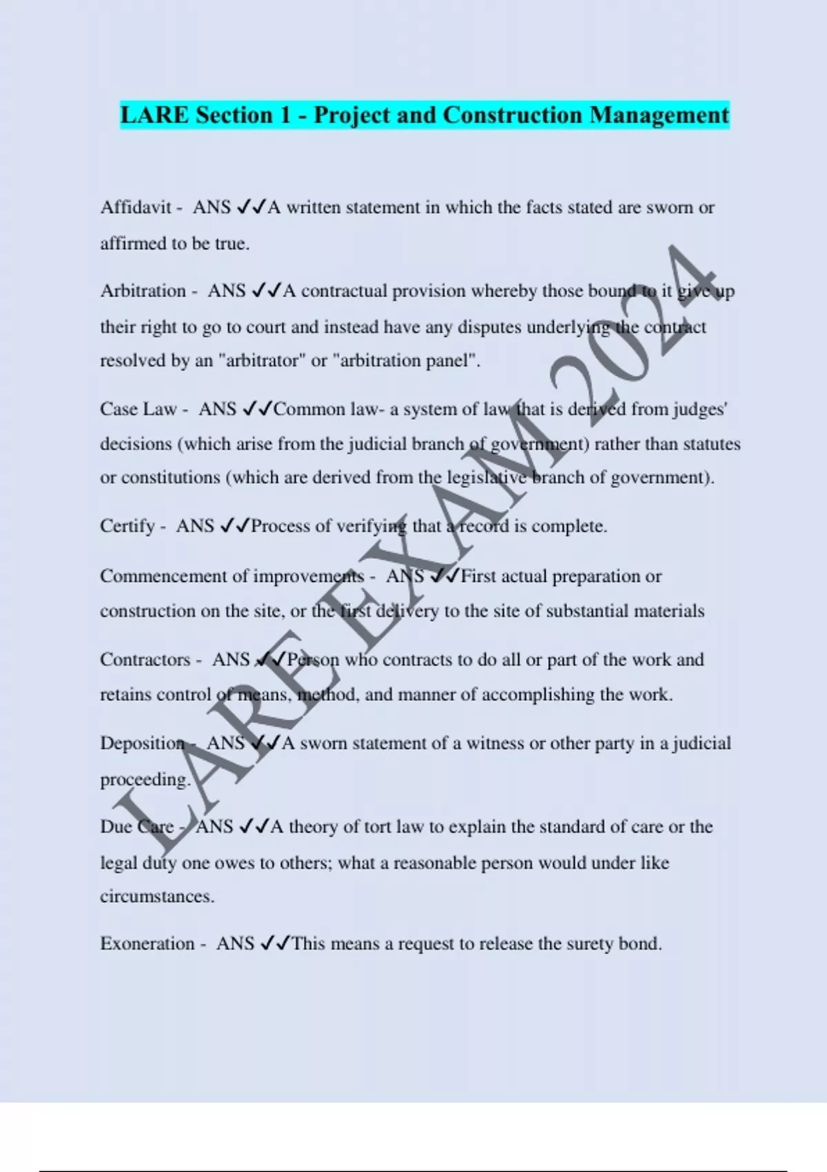 LARE Section 1 - Project and Construction Management Affidavit - ANS ️️ A written statement in which the facts stated are sworn or affirmed to be true. Arbitration - ANS ️️ A contractual provision whereby those bound to it give up their right to go to court and instead have any disputes underlying the contract resolved by an "arbitrator" or "arbitration panel". Case Law - ANS ️️ Common law- a system of law that is derived from judges' decisions (which arise from the judicial branch of government) rather than statutes or constitutions (which are derived from the legislative branch of government). Certify - ANS ️️ Process of verifying that a record is complete. Commencement of improvements - ANS ️️ First actual preparation or construction on the site, or the first delivery to the site of substantial materials Contractors - ANS ️️ Person who contracts to do all or part of the work and retains control of means, method, and manner of accomplishing the work. Deposition - ANS ️️ A sworn statement of a witness or other party in a judicial proceeding. Due Care - ANS ️️ A theory of tort law to explain the standard of care or the legal duty one owes to others; what a reasonable person would under like circumstances. Exoneration - ANS ️️ This means a request to release the surety bond. Improvements - ANS ️️ Refers to all of or part of the construction project. The statutes liberally define improvement as "any building, wharf, bridge, ditch, flume, reservoir, well, tunnel, fence, street, sidewalk, machinery and all other (applicable) structures or superstructures". Interest Holder - ANS ️️ Those who share ownership of the property and/or improvements with the owner - includes absentee owners, lessees, mortgagees (loan institutions or individual lenders). License - ANS ️️ A privilege or