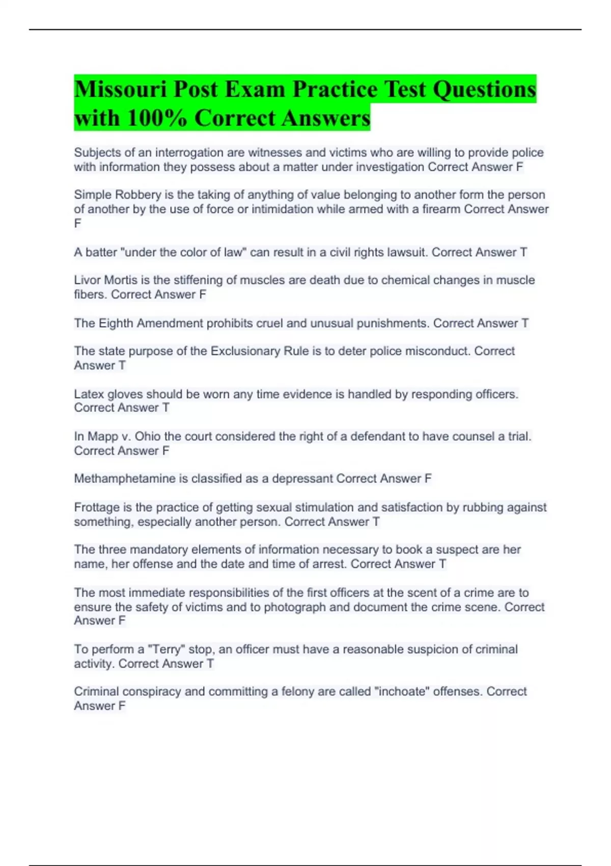 Missouri Post Exam Practice Test Questions with 100% Correct Answers