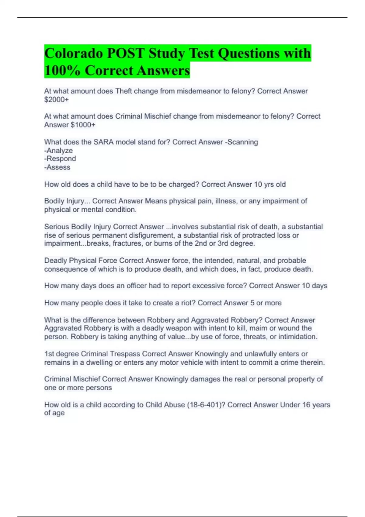 At what amount does Theft change from misdemeanor to felony? Correct Answer $2000+ At what amount does Criminal Mischief change from misdemeanor to felony? Correct Answer $1000+ What does the SARA model stand for? Correct Answer -Scanning -Analyze -Respond -Assess How old does a child have to be to be charged? Correct Answer 10 yrs old Bodily Injury... Correct Answer Means physical pain, illness, or any impairment of physical or mental condition. Serious Bodily Injury Correct Answer ...involves substantial risk of death, a substantial rise of serious permanent disfigurement, a substantial risk of protracted loss or impairment...breaks, fractures, or burns of the 2nd or 3rd degree. Deadly Physical Force Correct Answer force, the intended, natural, and probable consequence of which is to produce death, and which does, in fact, produce death. How many days does an officer had to report excessive force? Correct Answer 10 days How many people does it take to create a riot? Correct Answer 5 or more What is the difference between Robbery and Aggravated Robbery? Correct Answer Aggravated Robbery is with a deadly weapon with intent to kill, maim or wound the person. Robbery is taking anything of value...by use of force, threats, or intimidation. 1st degree Criminal Trespass Correct Answer Knowingly and unlawfully enters or remains in a dwelling or enters any motor vehicle with intent to commit a crime therein. Criminal Mischief Correct Answer Knowingly damages the real or personal property of one or more persons How old is a child according to Child Abuse (18-6-401)? Correct Answer Under 16 years of age