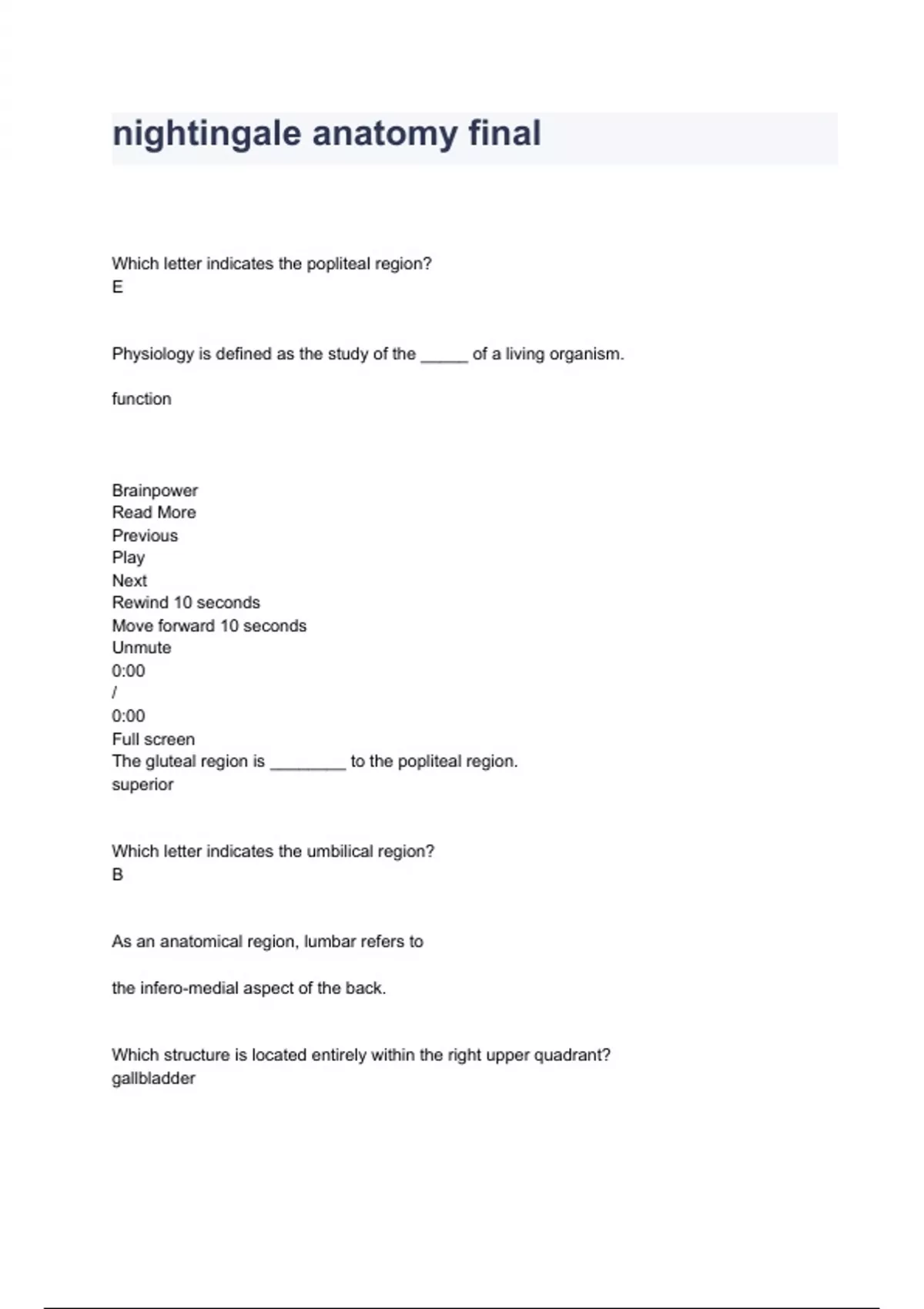 nightingale anatomy final Questions And Answers Which letter indicates the popliteal region? E Physiology is defined as the study of the _____ of a living organism. function Brainpower Read More Previous Play Next Rewind 10 seconds Move forward 10 seconds Unmute 0:00 / 0:00 Full screen The gluteal region is ________ to the popliteal region. superior Which letter indicates the umbilical region? B As an anatomical region, lumbar refers to the infero-medial aspect of the back. Which structure is located entirely within the right upper quadrant? gallbladder Which branch of anatomy studies the structural changes that occur as one ages? developmental anatomy Muscles are ________ to the skin. deep Anatomy is defined as the study of the _____ of a living organism. structure Another name for the midsagittal plane is median An example of a tissue in the body is epithelium All of the following are characteristics of human life except synthesis by scientists. The ________ system is involved in immunity. lymphatic The body as a whole can be subdivided into two major divisions. They are axial and appendicular. The inguinal region lies where the thigh joins the trunk A frontal plane is the same as a ________ plane. coronal