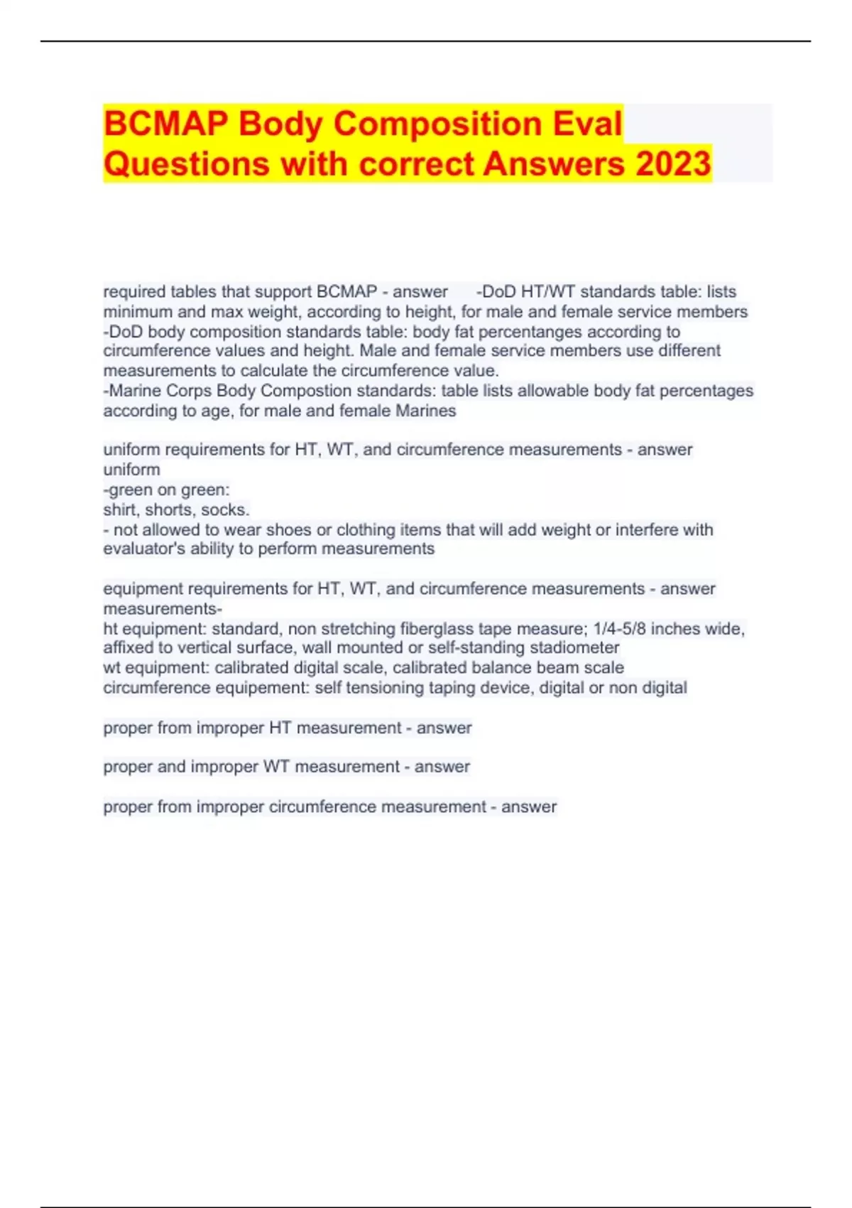 BCMAP Body Composition Eval Questions with correct Answers 2023 required tables that support BCMAP -DoD HT/WT standards table: lists minimum and max weight, according to height, for male and female service members -DoD body composition standards table: body fat percentanges according to circumference values and height. Male and female service members use different measurements to calculate the circumference value. -Marine Corps Body Compostion standards: table lists allowable body fat percentages according to age, for male and female Marines uniform requirements for HT, WT, and circumference measurements uniform -green on green: shirt, shorts, socks. - not allowed to wear shoes or clothing items that will add weight or interfere with evaluator's ability to perform measurements equipment requirements for HT, WT, and circumference measurements measurements- ht equipment: standard, non stretching fiberglass tape measure; 1/4-5/8 inches wide, affixed to vertical surface, wall mounted or self-standing stadiometer wt equipment: calibrated digital scale, calibrated balance beam scale circumference equipement: self tensioning taping device, digital or non digital proper from improper HT measurement proper and improper WT measurement proper from improper circumference measurement