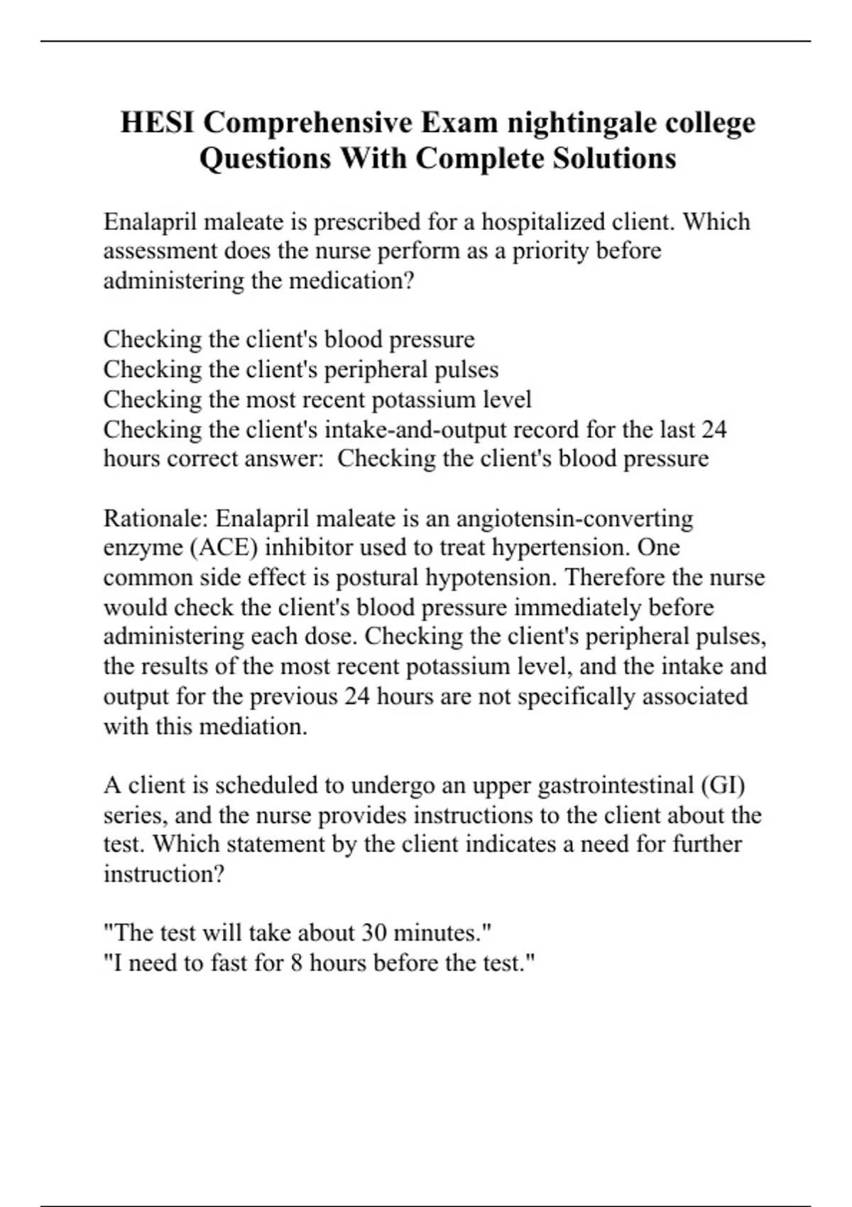 HESI Comprehensive Exam nightingale college Questions With Complete Solutions