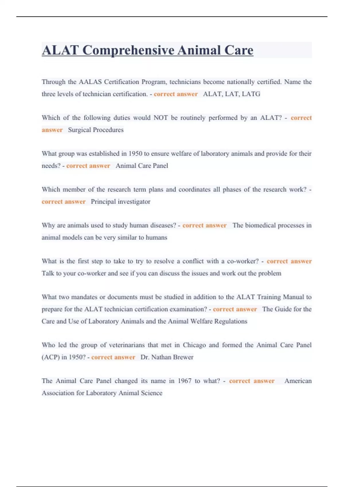 AALAS ALAT Comprehensive animal care Questions and answers 2023/2024 Through the AALAS Certification Program, technicians become nationally certified. Name the three levels of technician certification. - correct answer ALAT, LAT, LATG Which of the following duties would NOT be routinely performed by an ALAT? - correct answer Surgical Procedures What group was established in 1950 to ensure welfare of laboratory animals and provide for their needs? - correct answer Animal Care Panel Which member of the research term plans and coordinates all phases of the research work? - correct answer Principal investigator Why are animals used to study human diseases? - correct answer The biomedical processes in animal models can be very similar to humans What is the first step to take to try to resolve a conflict with a co-worker? - correct answer Talk to your co-worker and see if you can discuss the issues and work out the problem What two mandates or documents must be studied in addition to the ALAT Training Manual to prepare for the ALAT technician certification examination? - correct answer The Guide for the Care and Use of Laboratory Animals and the Animal Welfare Regulations Who led the group of veterinarians that met in Chicago and formed the Animal Care Panel (ACP) in 1950? - correct answer Dr. Nathan Brewer The Animal Care Panel changed its name in 1967 to what? - correct answer American Association for Laboratory Animal Science