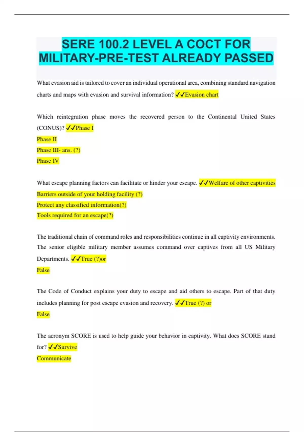 SERE 100.2 LEVEL A COCT FOR MILITARY-PRE-TEST ALREADY PASSED