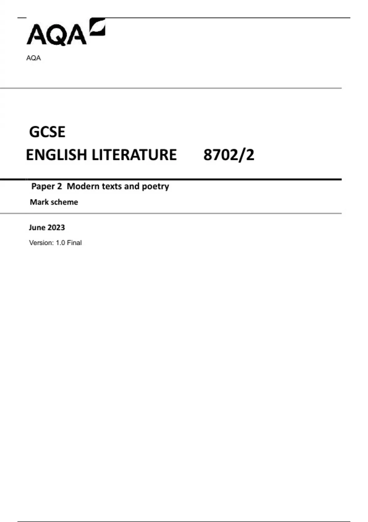 AQA GCSE ENGLISH LITERATURE 8702/2 Paper 2 Modern texts and poetry Mark scheme June 2023 Version: 1.0 Final
