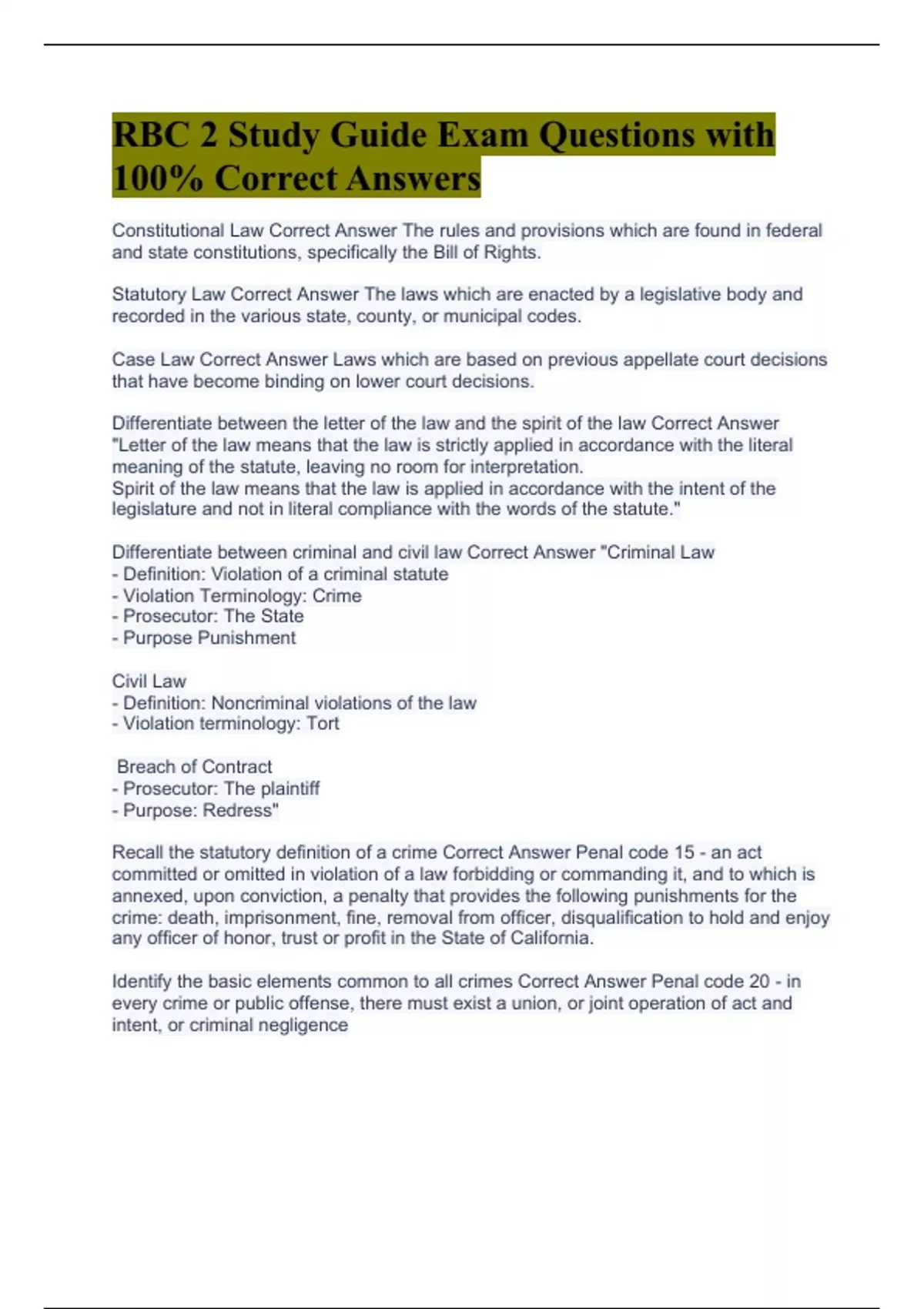 Constitutional Law Correct Answer The rules and provisions which are found in federal and state constitutions, specifically the Bill of Rights. Statutory Law Correct Answer The laws which are enacted by a legislative body and recorded in the various state, county, or municipal codes. Case Law Correct Answer Laws which are based on previous appellate court decisions that have become binding on lower court decisions. Differentiate between the letter of the law and the spirit of the law Correct Answer "Letter of the law means that the law is strictly applied in accordance with the literal meaning of the statute, leaving no room for interpretation. Spirit of the law means that the law is applied in accordance with the intent of the legislature and not in literal compliance with the words of the statute." Differentiate between criminal and civil law Correct Answer "Criminal Law - Definition: Violation of a criminal statute - Violation Terminology: Crime - Prosecutor: The State - Purpose Punishment Civil Law - Definition: Noncriminal violations of the law - Violation terminology: Tort Breach of Contract - Prosecutor: The plaintiff - Purpose: Redress" Recall the statutory definition of a crime Correct Answer Penal code 15 - an act committed or omitted in violation of a law forbidding or commanding it, and to which is annexed, upon conviction, a penalty that provides the following punishments for the crime: death, imprisonment, fine, removal from officer, disqualification to hold and enjoy any officer of honor, trust or profit in the State of California. Identify the basic elements common to all crimes Correct Answer Penal code 20 - in every crime or public offense, there must exist a union, or joint operation of act and intent, or criminal negligence Identify the basic elements required of an attempt to commit a crime Correct Answer An attempt to commit a crime consists of intent to commit that crime and a direct, but ineffectual, act done toward its commission General intent Correct Answer Intent is presumed and does not have to be proven. Definition of a crime consists only of the description of a particular act, without reference to intent Specific intent Correct Answer An element of a crime that must be proven and cannot be presumed; the requirement of the specific intent element varies according to the definition of the crime Transferred intent Correct Answer When an unlawful act affects a person other than, or in addition to, the person it was intended to affect Criminal Intent Correct Answer A mental state or frame of mind that the person knowingly did the particular criminal act (break the law). Criminal Negligence Correct Answer A negligent act that is aggravated or reckless, and constitutes indifference to the consequences Felony Correct Answer A crime punishable by a fine and/or imprisonment in state prison, death or removal from officer Misdemeanor Correct Answer A crime punishable by a fine and/or imprisonment in a county jail Wobbler Correct Answer A crime that can be either a felony or a misdemeanor. Principals to a crime Correct Answer "A principal to a crime is anyone who: - directly committed the offense - aided and abetted - advised and encouraged - counseled, advised, or encouraged children under the age of 14 years, or mentally incapacitated persons - by fraud, contrivance, or force, occasioned the drunkenness of another - by threats, menaces, command, or coercion compelled another" Accessories to a crime Correct Answer "An accessory is anyone who, after a felony has been committed, meets all the following requirements: (Penal Code Section 32) - has knowledge that the principal has committed, has been charged with, or has been convicted of committing a felony - harbors, conceals, or aids a principal in the felony - has the intention of assisting the principal to avoid or escape arrest, trial, conviction, or punishment