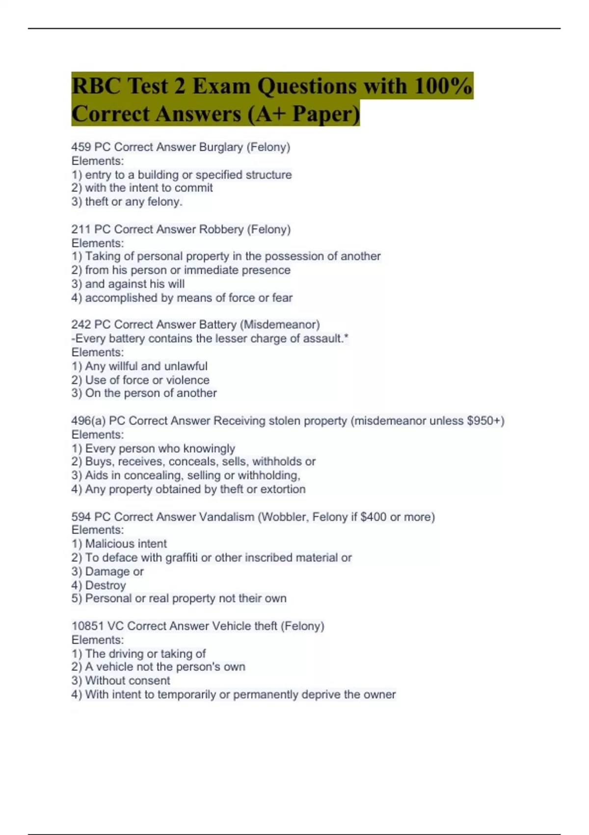 459 PC Correct Answer Burglary (Felony) Elements: 1) entry to a building or specified structure 2) with the intent to commit 3) theft or any felony. 211 PC Correct Answer Robbery (Felony) Elements: 1) Taking of personal property in the possession of another 2) from his person or immediate presence 3) and against his will 4) accomplished by means of force or fear 242 PC Correct Answer Battery (Misdemeanor) -Every battery contains the lesser charge of assault.* Elements: 1) Any willful and unlawful 2) Use of force or violence 3) On the person of another 496(a) PC Correct Answer Receiving stolen property (misdemeanor unless $950+) Elements: 1) Every person who knowingly 2) Buys, receives, conceals, sells, withholds or 3) Aids in concealing, selling or withholding, 4) Any property obtained by theft or extortion 594 PC Correct Answer Vandalism (Wobbler, Felony if $400 or more) Elements: 1) Malicious intent 2) To deface with graffiti or other inscribed material or 3) Damage or 4) Destroy 5) Personal or real property not their own 10851 VC Correct Answer Vehicle theft (Felony) Elements: 1) The driving or taking of 2) A vehicle not the person's own 3) Without consent 4) With intent to temporarily or permanently deprive the owner