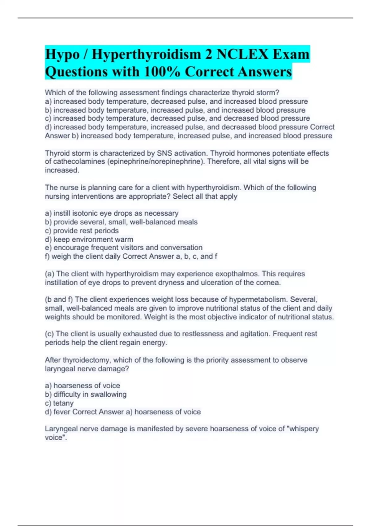 Hypo / Hyperthyroidism 2 NCLEX Exam Questions with 100% Correct Answers