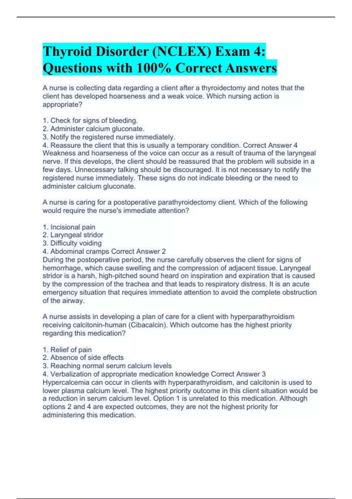 A nurse is collecting data regarding a client after a thyroidectomy and notes that the client has developed hoarseness and a weak voice. Which nursing action is appropriate? 1. Check for signs of bleeding. 2. Administer calcium gluconate. 3. Notify the registered nurse immediately. 4. Reassure the client that this is usually a temporary condition. Correct Answer 4 Weakness and hoarseness of the voice can occur as a result of trauma of the laryngeal nerve. If this develops, the client should be reassured that the problem will subside in a few days. Unnecessary talking should be discouraged. It is not necessary to notify the registered nurse immediately. These signs do not indicate bleeding or the need to administer calcium gluconate. A nurse is caring for a postoperative parathyroidectomy client. Which of the following would require the nurse's immediate attention? 1. Incisional pain 2. Laryngeal stridor 3. Difficulty voiding 4. Abdominal cramps Correct Answer 2 During the postoperative period, the nurse carefully observes the client for signs of hemorrhage, which cause swelling and the compression of adjacent tissue. Laryngeal stridor is a harsh, high-pitched sound heard on inspiration and expiration that is caused by the compression of the trachea and that leads to respiratory distress. It is an acute emergency situation that requires immediate attention to avoid the complete obstruction of the airway. A nurse assists in developing a plan of care for a client with hyperparathyroidism receiving calcitonin-human (Cibacalcin). Which outcome has the highest priority regarding this medication? 1. Relief of pain 2. Absence of side effects 3. Reaching normal serum calcium levels 4. Verbalization of appropriate medication knowledge Correct Answer 3 Hypercalcemia can occur in clients with hyperparathyroidism, and calcitonin is used to lower plasma calcium level. The highest priority outcome in this client situation would be a reduction in serum calcium level. Option 1 is unrelated to this medication. Although options 2 and 4 are expected outcomes, they are not the highest priority for administering this medication. A nurse would expect to note which interventions in the plan of care for a client with hypothyroidism? Select all that apply. 1. Provide a cool environment for the client. 2. Instruct the client to consume a high-fat diet. 3. Instruct the client about thyroid replacement therapy. 4. Encourage the client to consume fluids and high-fiber foods in the diet. 5. Instruct the client to contact the health care provider if episodes of chest pain occur. 6. Inform the client that iodine preparations will be prescribed to treat the disorder. Correct Answer 345 The clinical manifestations of hypothyroidism are the result of decreased metabolism from low levels of thyroid hormone. Interventions are aimed at replacement of the hormones and providing measures to support the signs and symptoms related to a decreased metabolism. The nurse encourages the client to consume a well-balanced diet that is low in fat for weight reduction and high in fluids and high-fiber foods to prevent constipation. The client often has cold intolerance and requires a warm environment. The client would notify the health care provider if chest pain occurs since it could be an indication of overreplacement of thyroid hormone. Iodine preparations are used to treat hyperthyroidism. These medications decrease blood flow through the thyroid gland and reduce the production and release of thyroid hormone. A nurse is caring for a client after thyroidectomy and monitoring for signs of thyroid storm. The nurse understands that which of the following is a manifestation associated with this disorder? 1. Bradycardia 2. Hypotension 3. Constipation 4. Hypothermia Correct Answer 2 Clinical manifestations associated with thyroid storm include a fever as high as 106° F (41.1° C), severe tachycardia, profuse diarrhea, extreme vasodilation, hypotension, atrial fibrillation, hyperreflexia, abdominal pain, diarrhea, and dehydration. With this disorder, the client's condition can rapidly progress to coma and cardiovascular collapse. What would the nurse anticipate being included in the plan of care for a client who has been diagnosed with Graves' disease? 1. Provide a high-fiber diet. 2. Provide a restful environment. 3. Provide three small meals per day. 4. Provide the client with extra blankets. Correct Answer 2 Because of the hypermetabolic state, the client with Graves' disease needs to be provided with an environment that is restful both physically and mentally. Six full meals a day that are well balanced and high in calories are required, because of the