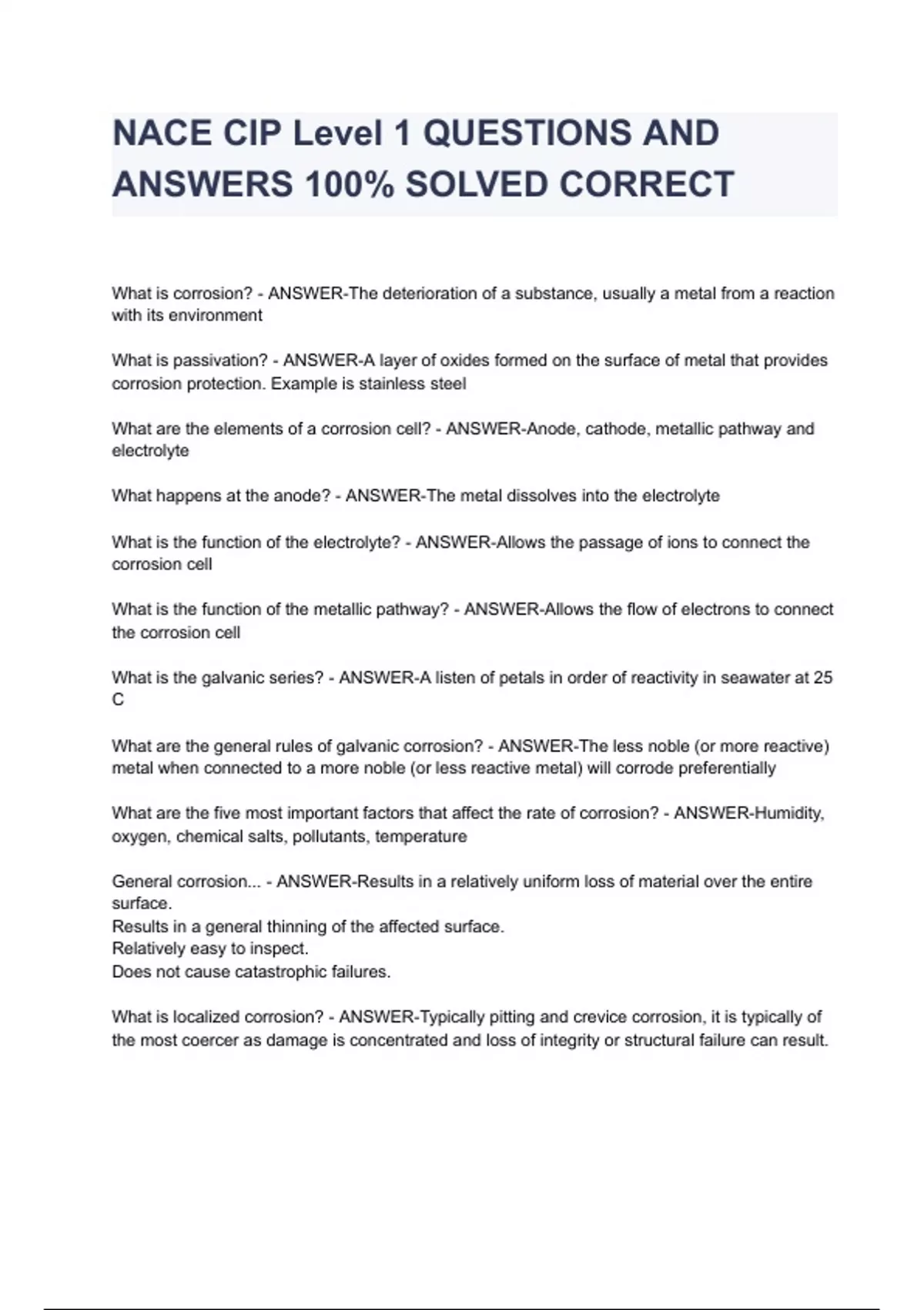 NACE CIP Level 1 QUESTIONS AND ANSWERS 100% SOLVED CORRECT