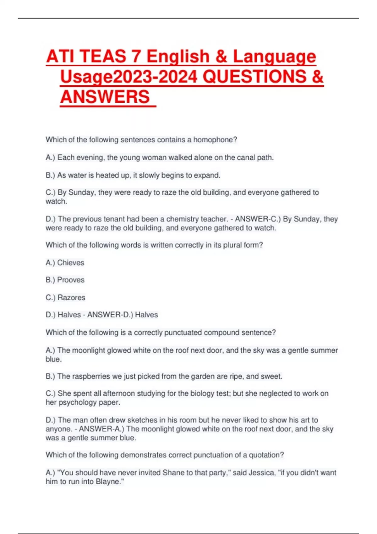 ATI TEAS 7 English & Language Usage QUESTIONS & ANSWERS Which of the following sentences contains a homophone? A.) Each evening, the young woman walked alone on the canal path. B.) As water is heated up, it slowly begins to expand. C.) By Sunday, they were ready to raze the old building, and everyone gathered to watch. D.) The previous tenant had been a chemistry teacher. - ANSWER-C.) By Sunday, they were ready to raze the old building, and everyone gathered to watch. Which of the following words is written correctly in its plural form? A.) Chieves B.) Prooves C.) Razores D.) Halves - ANSWER-D.) Halves Which of the following is a correctly punctuated compound sentence? A.) The moonlight glowed white on the roof next door, and the sky was a gentle summer blue. B.) The raspberries we just picked from the garden are ripe, and sweet. C.) She spent all afternoon studying for the biology test; but she neglected to work on her psychology paper. D.) The man often drew sketches in his room but he never liked to show his art to anyone. - ANSWER-A.) The moonlight glowed white on the roof next door, and the sky was a gentle summer blue. Which of the following demonstrates correct punctuation of a quotation? A.) "You should have never invited Shane to that party," said Jessica, "if you didn't want him to run into Blayne." B.) "You should have never invited Shane to that party," said Jessica. "If you didn't want him to run into Blayne." C.) You should have never invited Shane to that party," said Jessica "if you didn't want him to run into Blayne." D.) "You should have never invited Shane to that party," said Jessica, "If you didn't want him to run into Blayne." - ANSWER-A.) "You should have never invited Shane to that party," said Jessica, "if you didn't want him to run into Blayne."