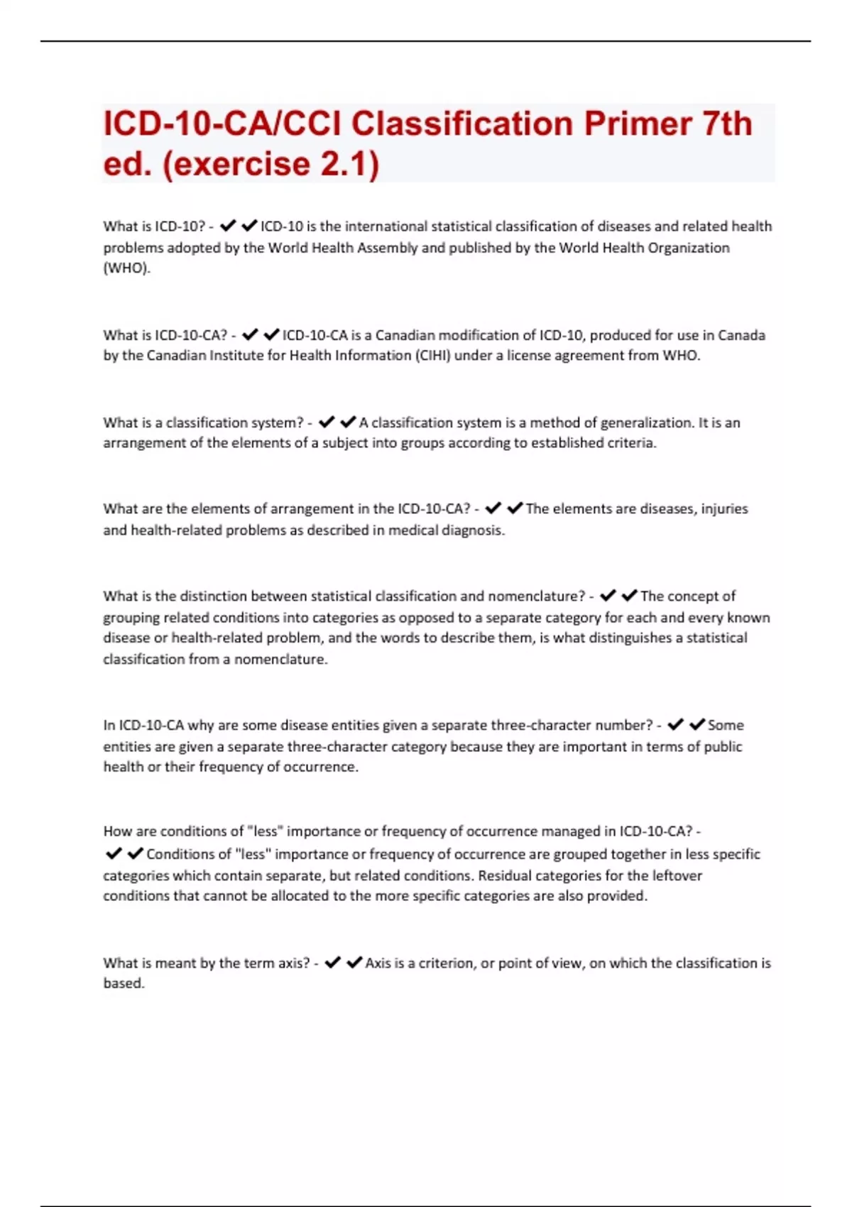 ICD-10-CA/CCI Classification Primer 7th ed. (exercise 2.1) Questions With 100% Correct Answers.