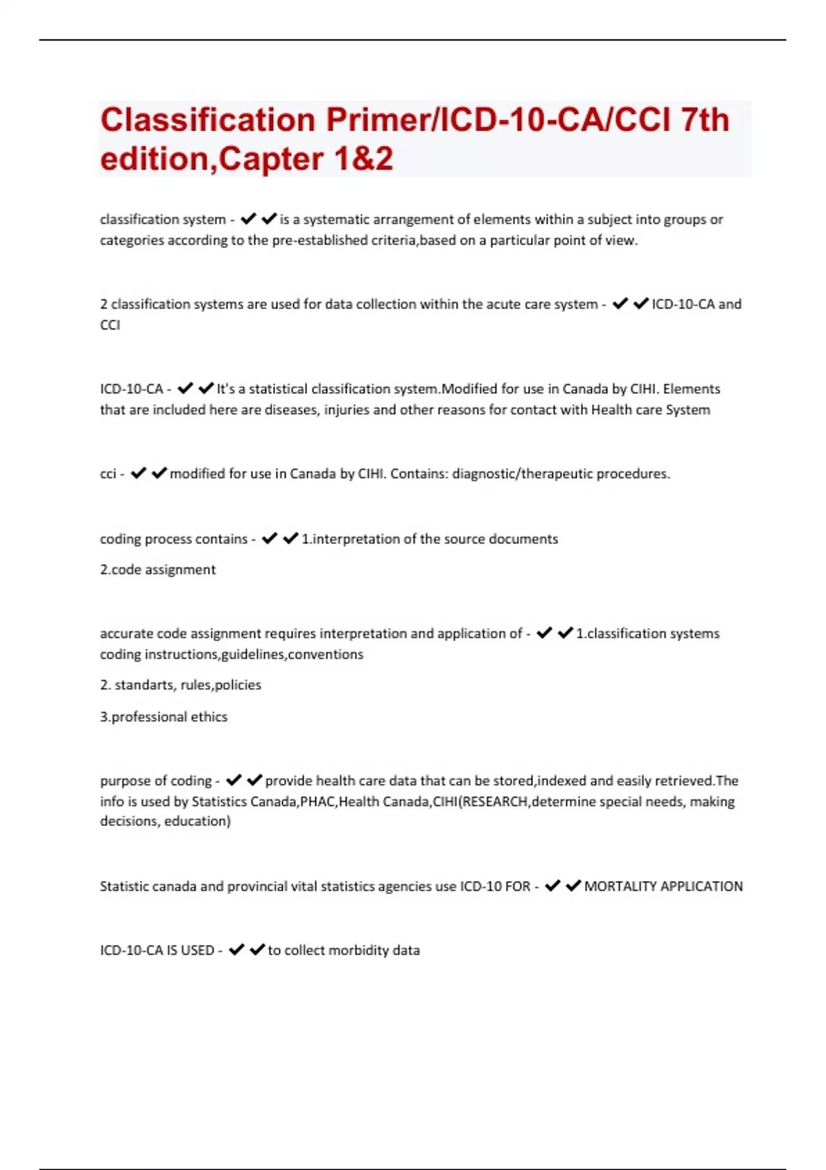classification system - is a systematic arrangement of elements within a subject into groups or categories according to the pre-established criteria,based on a particular point of view. 2 classification systems are used for data collection within the acute care system - ICD-10-CA and CCI ICD-10-CA - It's a statistical classification system.Modified for use in Canada by CIHI. Elements that are included here are diseases, injuries and other reasons for contact with Health care System cci - modified for use in Canada by CIHI. Contains: diagnostic/therapeutic procedures. coding process contains - pretation of the source documents assignment accurate code assignment requires interpretation and application of - ification systems coding instructions,guidelines,conventions 2. standarts, rules,policies ssional ethics purpose of coding - provide health care data that can be stored,indexed and easily retrieved.The info is used by Statistics Canada,PHAC,Health Canada,CIHI(RESEARCH,determine special needs, making decisions, education) Statistic canada and provincial vital statistics agencies use ICD-10 FOR - MORTALITY APPLICATION ICD-10-CA IS USED - to collect morbidity dataCIHI - USES ICD-10-CA INDEPENDENT,NOT-FOR PROFIT ORGANIZATION MANDATED BY FEDERAL AND PROVINCIAL TERRITORIAL MINISTERS. pURPOSE: TO PROVIDE RELEVANT, OBJECTIVE, ACCURATE AND TIMELY HEALTH INFO. ICD-10-CA AND CCI - HAVE BEEN ADOPTED AS THE EXCLUSIVE NATIONAL STANDARDS FOR DIAGNOSIS AND INTERVENTION CLASSIFICATION SINCE April 1,2001 diseases - conditions numenclature - it's a terminology list, provides a separate category for each and every known disease/health related problem axis - is the criterion on which the classification is based. primary axes includes - epidemic diseases constitutional/general diseases local diseases developmental injuries 2 major components of ICD-10-CA - 1. Alphabetical index 2.Tabular list Alphabetical index - it's alphabetical listing of diseases, injuries, factors influencing health status or other reasons for contact with the health care system leading to the codes in the tabular list. must always be referenced first before proceeding to the tabular list organized by lead terms with secondary terms lead term - indicate the noun expressed as the name of disease, injury, factor influencing health status or reason for contact with health servicessecondary terms - also called sub terms are adjectives and are described as modifiers -modify the lead term by providing additional details(site,type,etiology) tabular list - 1. classification itself. 2. consist of numeric listing in alphanumeric order of diagnosis codes,injury codes and codes describing factors influencing health status or other reasons for contact with the health care system. 3. consists of chapters, blocks and categories. chapter - 23 most correspond to the primary axes(neoplasia,respiratory system,nervous system) a condition should be preferably classified to the special group chapter each letter is associated with a particular chapter important info is provided in the beginning of all chapters- to ensure accurate code assignments. subdivided into blocks of 3 character categories blocks - categories of a related group of diseases /health related problems(D50-D53) 3 character category(D50) - represent a group of closely related conditions or a single disease. IS USED WHEN THE CATEGORY has not been further subdivided. RESIDUAL CATEGORIES -other and unspecified categories are referred to this category(N32- OTHER DISORDERS OF BLADDER) .8-is used for other conditions within the 3-character category.(N64.8-other specified disorders of breast) .9-is used to represent the unspecified conditions within the 3-character category(N64.9- DISORDERS OF BREAST UNSPECIFIED) .- - INCOMPLETE CODEHYPERLINKS - the alphabetical index leads to the codes in the tabular list ----- - more specifity essential modifiers - secondary terms affect the code selection nonessential modifiers - appear before the code in parentheses do not affect code selection specified NEC - not elsewhere classified-when a condition is described specifically,but not secondary term can be located. indicators for using: 1.a specific term used in documentation is not listed as a secondary term term used fits the axis of the category/subcategory term can't be assigned to a synonymous term unspecified NOS - not otherwise specified- documentation does not provide the specific information concerning the condition to permit assignment of a more specific code (*)asterisk - indicates that both codes must be assigned inclusion terms - synonyms,examples exclusion notes(terms) - are not classified to that category,are classified elsewhere