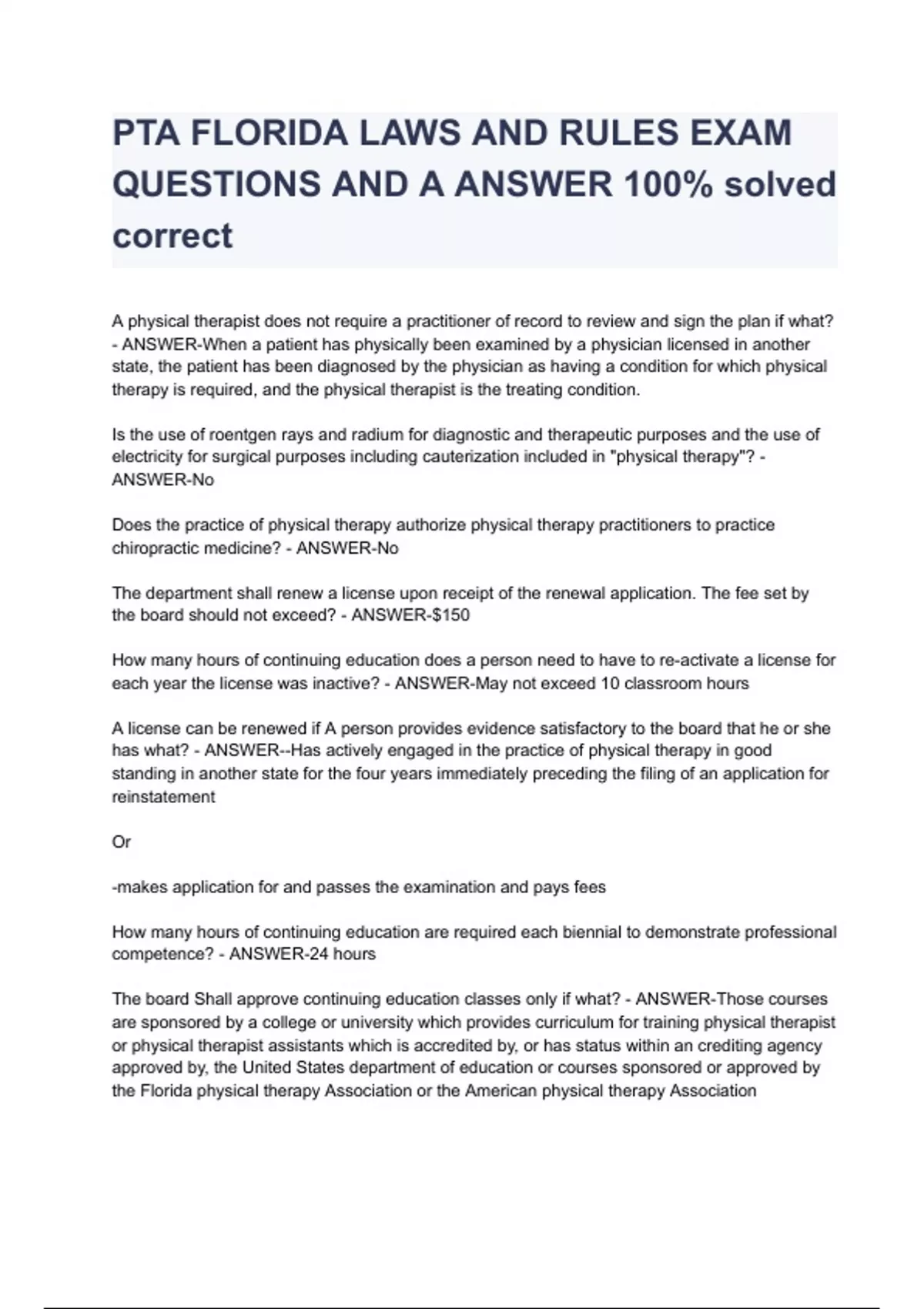 PTA FLORIDA LAWS AND RULES EXAM QUESTIONS AND A ANSWER 100% solved correct