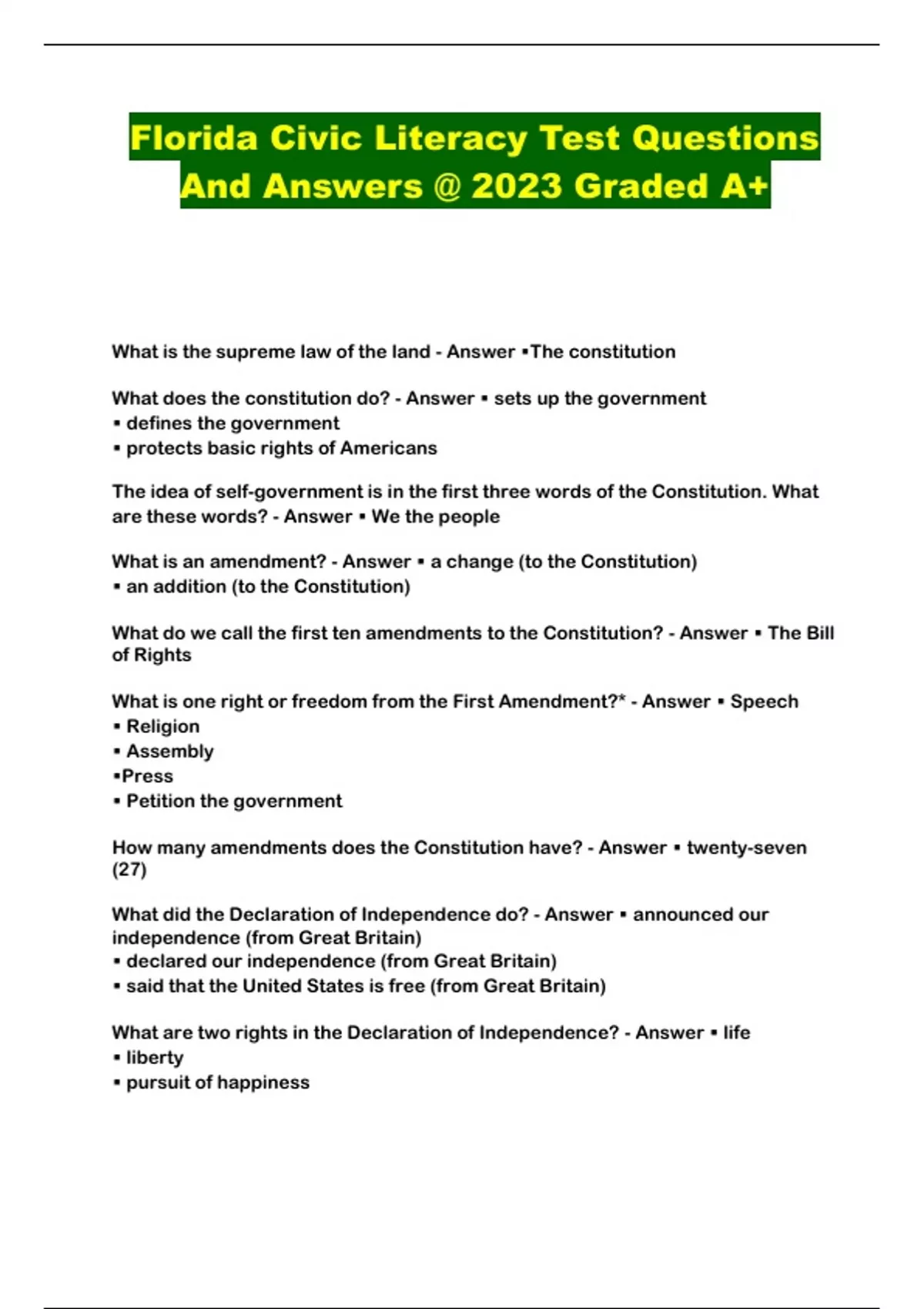 What is the supreme law of the land - Answer ▪The constitution What does the constitution do? - Answer ▪ sets up the government ▪ defines the government ▪ protects basic rights of Americans The idea of self-government is in the first three words of the Constitution. What are these words? - Answer ▪ We the people What is an amendment? - Answer ▪ a change (to the Constitution) ▪ an addition (to the Constitution) What do we call the first ten amendments to the Constitution? - Answer ▪ The Bill of Rights What is one right or freedom from the First Amendment?* - Answer ▪ Speech ▪ Religion ▪ Assembly ▪Press ▪ Petition the government How many amendments does the Constitution have? - Answer ▪ twenty-seven (27