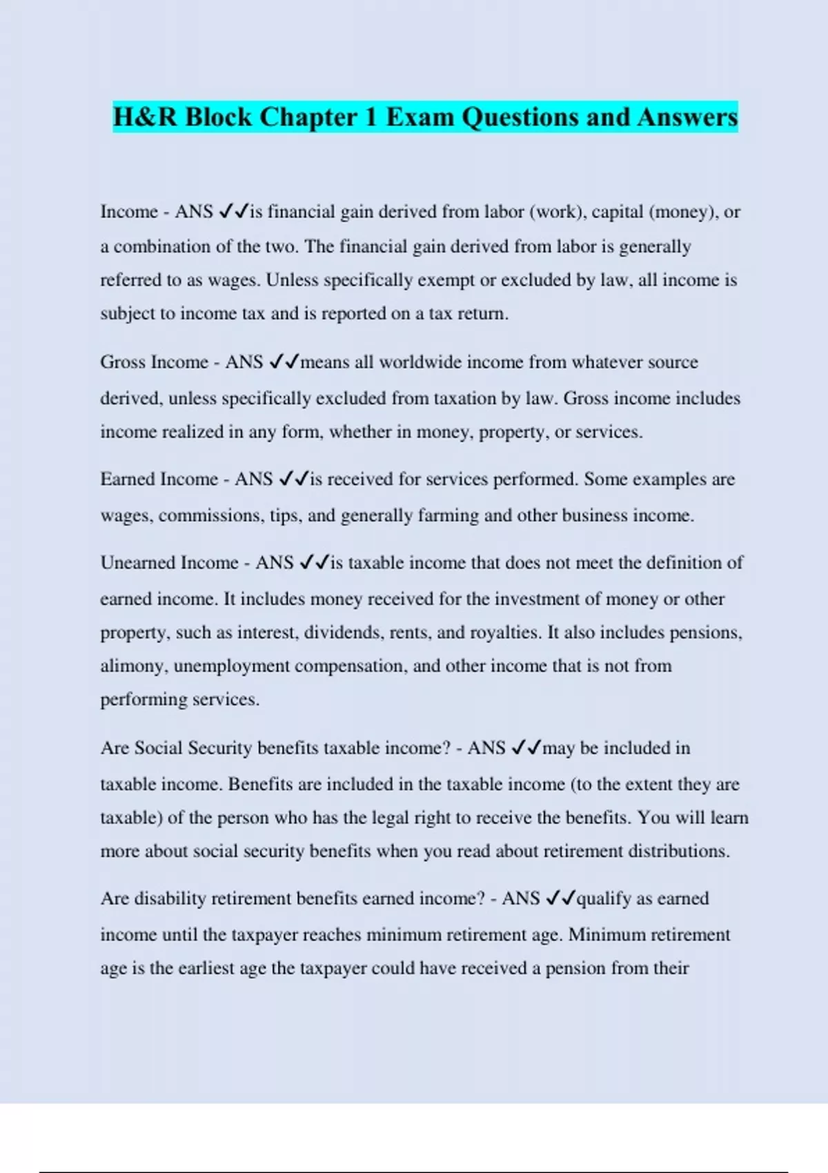 H&R Block Chapter 1 Exam Questions and Answers Income - ANS ️️ is financial gain derived from labor (work), capital (money), or a combination of the two. The financial gain derived from labor is generally referred to as wages. Unless specifically exempt or excluded by law, all income is subject to income tax and is reported on a tax return. Gross Income - ANS ️️ means all worldwide income from whatever source derived, unless specifically excluded from taxation by law. Gross income includes income realized in any form, whether in money, property, or services. Earned Income - ANS ️️ is received for services performed. Some examples are wages, commissions, tips, and generally farming and other business income. Unearned Income - ANS ️️ is taxable income that does not meet the definition of earned income. It includes money received for the investment of money or other property, such as interest, dividends, rents, and royalties. It also includes pensions, alimony, unemployment compensation, and other income that is not from performing services. Are Social Security benefits taxable income? - ANS ️️ may be included in taxable income. Benefits are included in the taxable income (to the extent they are taxable) of the person who has the legal right to receive the benefits. You will learn more about social security benefits when you read about retirement distributions. Are disability retirement benefits earned income? - ANS ️️ qualify as earned income until the taxpayer reaches minimum retirement age. Minimum retirement age is the earliest age the taxpayer could have received a pension from their