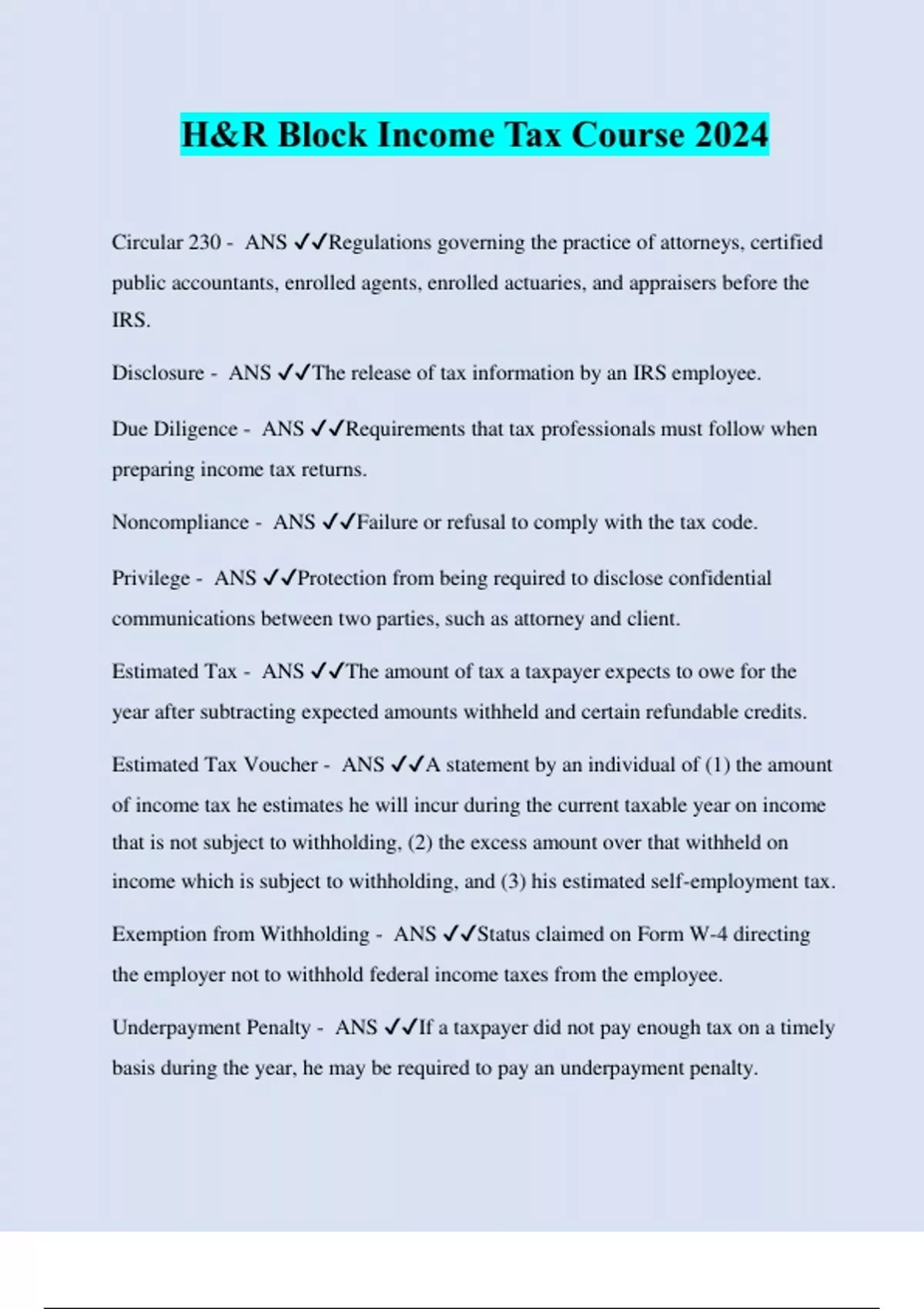H&R Block Income Tax Course 2024 Circular 230 - ANS ️️ Regulations governing the practice of attorneys, certified public accountants, enrolled agents, enrolled actuaries, and appraisers before the IRS. Disclosure - ANS ️️ The release of tax information by an IRS employee. Due Diligence - ANS ️️ Requirements that tax professionals must follow when preparing income tax returns. Noncompliance - ANS ️️ Failure or refusal to comply with the tax code. Privilege - ANS ️️ Protection from being required to disclose confidential communications between two parties, such as attorney and client. Estimated Tax - ANS ️️ The amount of tax a taxpayer expects to owe for the year after subtracting expected amounts withheld and certain refundable credits. Estimated Tax Voucher - ANS ️️ A statement by an individual of (1) the amount of income tax he estimates he will incur during the current taxable year on income that is not subject to withholding, (2) the excess amount over that withheld on income which is subject to withholding, and (3) his estimated self-employment tax. Exemption from Withholding - ANS ️️ Status claimed on Form W-4 directing the employer not to withhold federal income taxes from the employee. Underpayment Penalty - ANS ️️ If a taxpayer did not pay enough tax on a timely basis during the year, he may be required to pay an underpayment penalty. Withholding Allowances - ANS ️️ An increase by which income tax withholding on certain income is reduced. Two Ways to Pay as You Go - ANS ️️ Withholding and Estimated Tax Payments Form W-4 - ANS ️️ Employee's Withholding Allowance Certificate Form 8815 - ANS ️️ Exclusion of Interest From Series EE and I U.S. Savings Bonds Issued After 1989 Form 2210 - ANS ️️ Underpayment of Estimated Tax by Individuals, Estates, and Trusts Form 4868 - ANS ️️ Application for Automatic Extension of Time To File U.S. Individual Income Tax Return Form 8888 - ANS ️️ Allocation of Refund Form 9465 - ANS ️️ Installment Agreement Request Amended Return - ANS ️️ A tax return filed on Form 1040X after the original return has been filed. Closed Year - ANS ️️ A tax year for which the statute of limitations has expired. Open Year - ANS ️️ A taxable year for which the statute of limitations has not yet expir