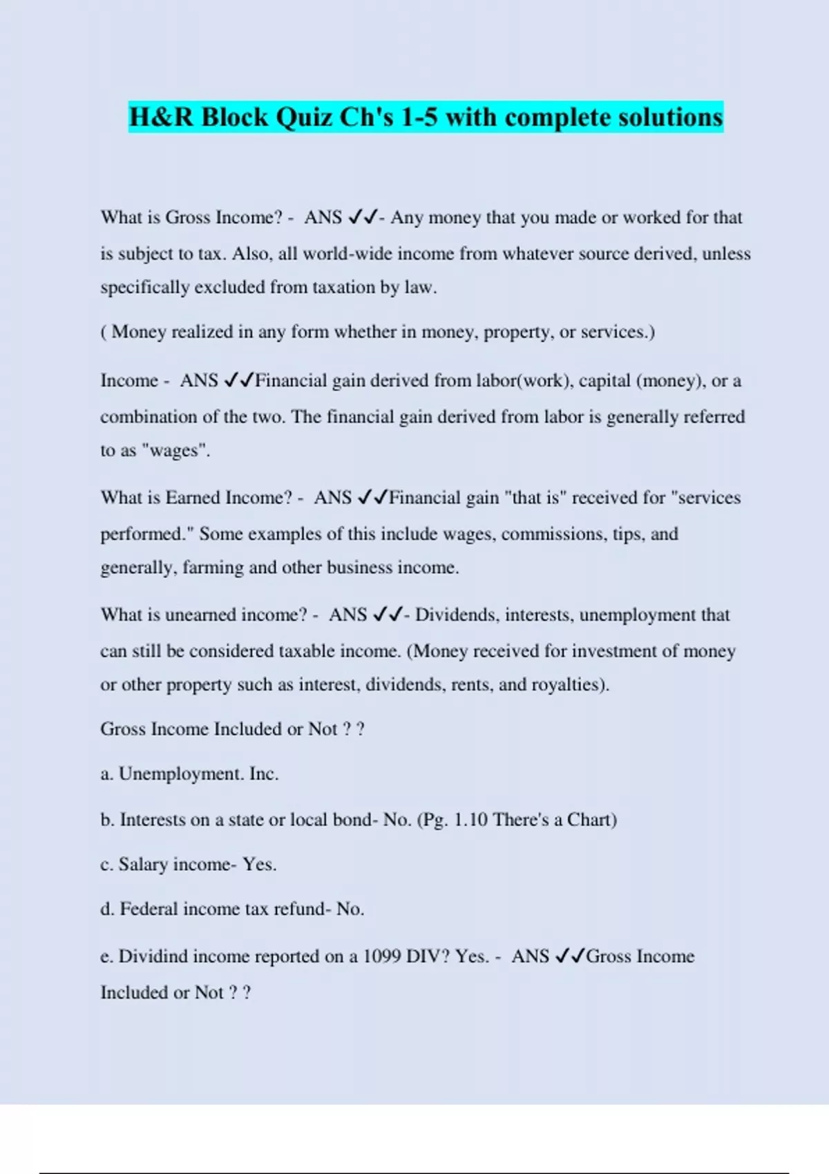 H&R Block Quiz Ch's 1-5 with complete solutions What is Gross Income? - ANS ️️ - Any money that you made or worked for that is subject to tax. Also, all world-wide income from whatever source derived, unless specifically excluded from taxation by law. ( Money realized in any form whether in money, property, or services.) Income - ANS ️️ Financial gain derived from labor(work), capital (money), or a combination of the two. The financial gain derived from labor is generally referred to as "wages". What is Earned Income? - ANS ️️ Financial gain "that is" received for "services performed." Some examples of this include wages, commissions, tips, and generally, farming and other business income. What is unearned income? - ANS ️️ - Dividends, interests, unemployment that can still be considered taxable income. (Money received for investment of money or other property such as interest, dividends, rents, and royalties). Gross Income Included or Not ? ? a. Unemployment. Inc. b. Interests on a state or local bond- No. (Pg. 1.10 There's a Chart) c. Salary income- Yes. d. Federal income tax refund- No. e. Dividind income reported on a 1099 DIV? Yes. - ANS ️️ Gross Income Included or Not ? ?