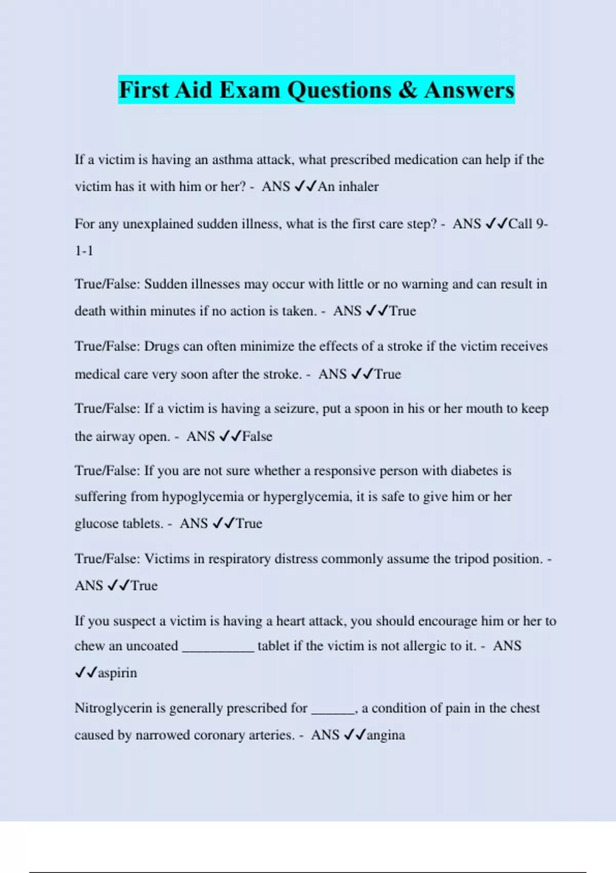 First Aid Exam Questions & Answers If a victim is having an asthma attack, what prescribed medication can help if the victim has it with him or her? - ANS ️️ An inhaler For any unexplained sudden illness, what is the first care step? - ANS ️️ Call 9- 1-1 True/False: Sudden illnesses may occur with little or no warning and can result in death within minutes if no action is taken. - ANS ️️ True True/False: Drugs can often minimize the effects of a stroke if the victim receives medical care very soon after the stroke. - ANS ️️ True True/False: If a victim is having a seizure, put a spoon in his or her mouth to keep the airway open. - ANS ️️ False True/False: If you are not sure whether a responsive person with diabetes is suffering from hypoglycemia or hyperglycemia, it is safe to give him or her glucose tablets. - ANS ️️ True True/False: Victims in respiratory distress commonly assume the tripod position. - ANS ️️ True If you suspect a victim is having a heart attack, you should encourage him or her to chew an uncoated __________ tablet if the victim is not allergic to it. - ANS ️️ aspirin Nitroglycerin is generally prescribed for ______, a condition of pain in the chest caused by narrowed coronary arteries. - ANS ️️ angina