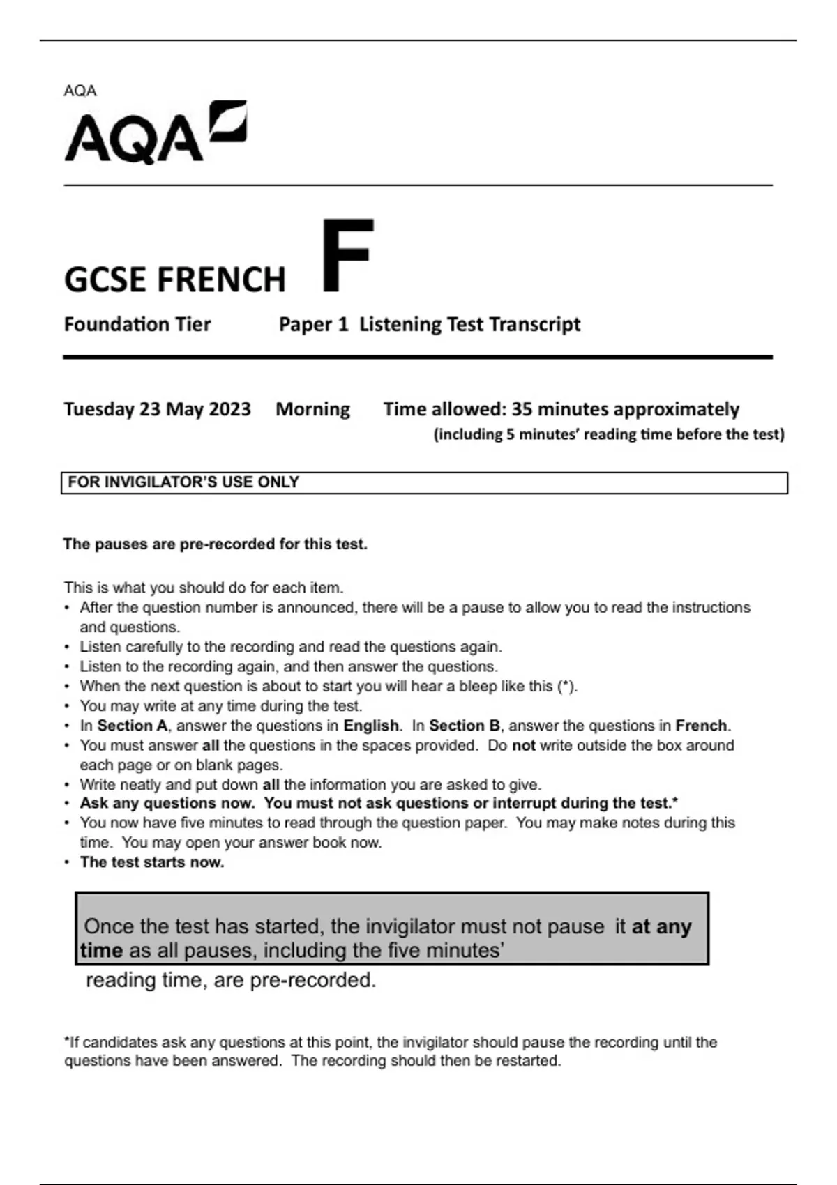 AQA GCSE FRENCH F Foundation Tier Paper 1 Listening Test Transcript 8658-LF-T-TRAN-French-G-23May23