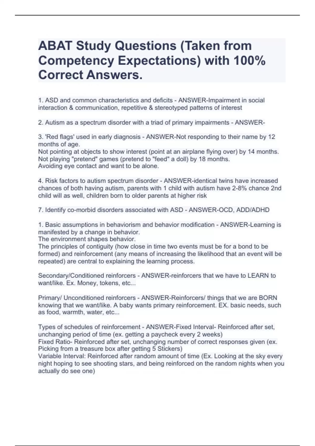 1. ASD and common characteristics and deficits - ANSWER-Impairment in social interaction & communication, repetitive & stereotyped patterns of interest 2. Autism as a spectrum disorder with a triad of primary impairments - ANSWER- 3. 'Red flags' used in early diagnosis - ANSWER-Not responding to their name by 12 months of age. Not pointing at objects to show interest (point at an airplane flying over) by 14 months. Not playing "pretend" games (pretend to "feed" a doll) by 18 months. Avoiding eye contact and want to be alone. 4. Risk factors to autism spectrum disorder - ANSWER-identical twins have increased chances of both having autism, parents with 1 child with autism have 2-8% chance 2nd child will as well, children born to older parents at higher risk 7. Identify co-morbid disorders associated with ASD - ANSWER-OCD, ADD/ADHD 1. Basic assumptions in behaviorism and behavior modification - ANSWER-Learning is manifested by a change in behavior. The environment shapes behavior. The principles of contiguity (how close in time two events must be for a bond to be formed) and reinforcement (any means of increasing the likelihood that an event will be repeated) are central to explaining the learning process. Secondary/Conditioned reinforcers - ANSWER-reinforcers that we have to LEARN to want/like. Ex. Money, tokens, etc... Primary/ Unconditioned reinforcers - ANSWER-Reinforcers/ things that we are BORN knowing that we want/like. A baby wants primary reinforcement. EX. basic needs, such as food, warmth, water, etc... Types of schedules of reinforcement - ANSWER-Fixed Interval- Reinforced after set, unchanging period of time (ex. getting a paycheck every 2 weeks) Fixed Ratio- Reinforced after set, unchanging number of correct responses given (ex. Picking from a treasure box after getting 5 Stickers) Variable Interval: Reinforced after random amount of time (Ex. Looking at the sky every night hoping to see shooting stars, and being reinforced on the random nights when you actually do see one) Variable Ratio: Reinforced after random amount of responses (Gambling) 6. Contingent Reinforcement - ANSWER-Reinforcer always occurs following response, never in absence of response; ex. When asking a question that has stimulus control, (Presenting an SD), the client being reinforced is CONTINGENT on them answering correctly. Non-contingent reinforcement (NCR) - ANSWER-Reinforcer is always given no matter what the behavior happening is, usually given on a set schedule over time (Fixed Interval), such as providing reinforcement, such as game time, every 10 minutes no matter what happened during the 10 minutes. 7. Terms and definitions of Applied Verbal Behavior (AVB) - ANSWER-When applied, language that has the same form can have different functions. Ex. you may say candy because you want candy (mand), or you may say candy because you see candy (tact) Positive behavior support systems (PBS) - ANSWER-PBS focuses on replacing problem behavior with more appropriate alternatives•Primarily uses antecedent-based interventions and reinforcement to address problem behavior and teach replacement behaviors.