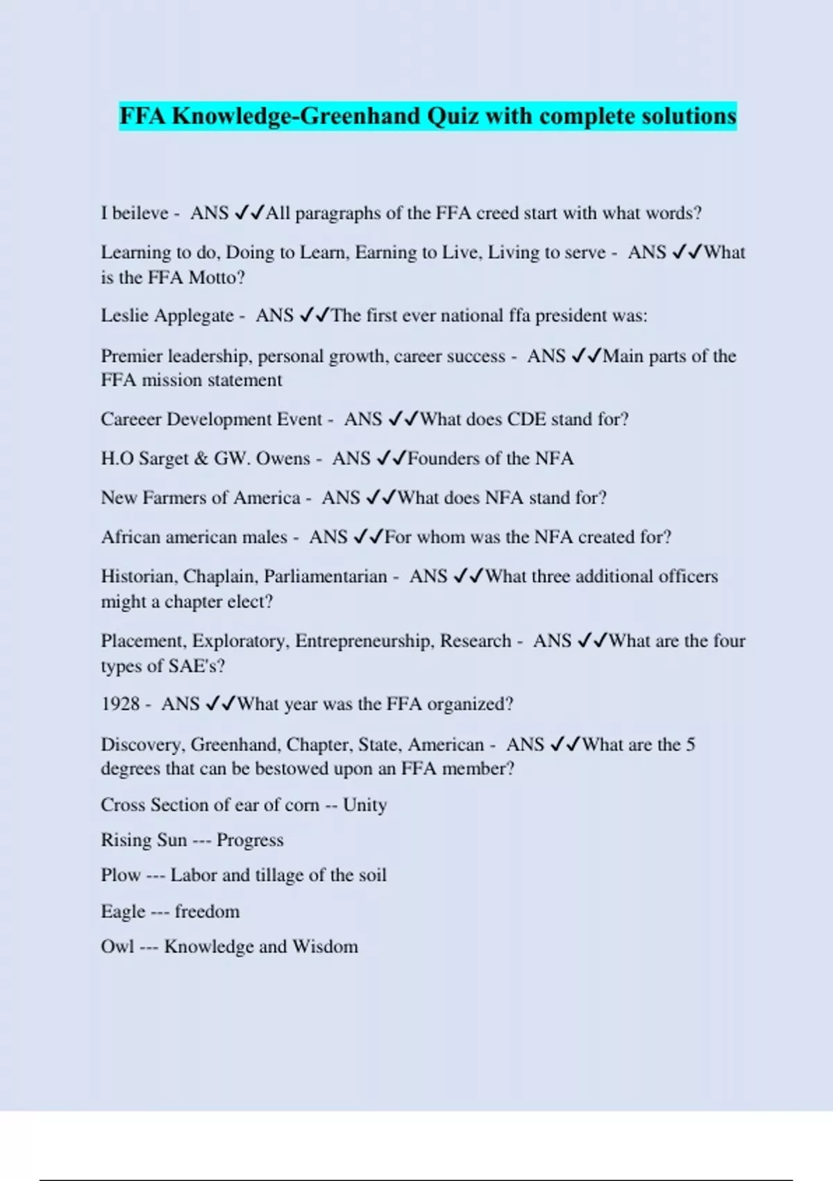 FFA Knowledge-Greenhand Quiz with complete solutions