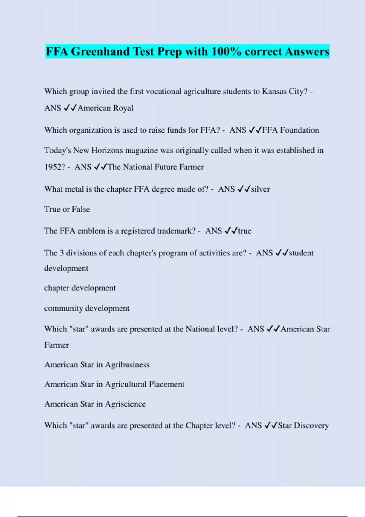 FFA Greenhand Test Prep with 100% correct Answers Which group invited the first vocational agriculture students to Kansas City? - ANS ️️ American Royal Which organization is used to raise funds for FFA? - ANS ️️ FFA Foundation Today's New Horizons magazine was originally called when it was established in 1952? - ANS ️️ The National Future Farmer What metal is the chapter FFA degree made of? - ANS ️️ silver True or False The FFA emblem is a registered trademark? - ANS ️️ true The 3 divisions of each chapter's program of activities are? - ANS ️️ student development chapter development community development Which "star" awards are presented at the National level? - ANS ️️ American Star Farmer American Star in Agribusiness American Star in Agricultural Placement American Star in Agriscience Which "star" awards are presented at the Chapter level? - ANS ️️ Star Discovery