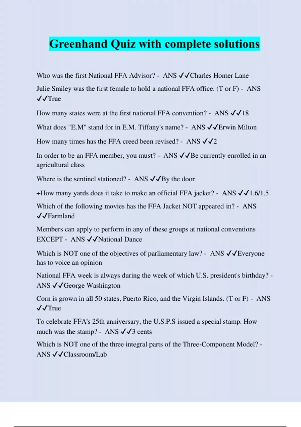 Greenhand Quiz with complete solutions Who was the first National FFA Advisor? - ANS ️️ Charles Homer Lane Julie Smiley was the first female to hold a national FFA office. (T or F) - ANS ️️ True How many states were at the first national FFA convention? - ANS ️️ 18 What does "E.M" stand for in E.M. Tiffany's name? - ANS ️️ Erwin Milton How many times has the FFA creed been revised? - ANS ️️ 2 In order to be an FFA member, you must? - ANS ️️ Be currently enrolled in an agricultural class Where is the sentinel stationed? - ANS ️️ By the door +How many yards does it take to make an official FFA jacket? - ANS ️️ 1.6/1.5 Which of the following movies has the FFA Jacket NOT appeared in? - ANS ️️ Farmland Members can apply to perform in any of these groups at national conventions EXCEPT - ANS ️️ National Dance Which is NOT one of the objectives of parliamentary law? - ANS ️️ Everyone has to voice an opinion National FFA week is always during the week of which U.S. president's birthday? - ANS ️️ George Washington Corn is grown in all 50 states, Puerto Rico, and the Virgin Islands. (T or F) - ANS ️️ True To celebrate FFA's 25th anniversary, the U.S.P.S issued a special stamp. How much was the stamp? - ANS ️️ 3 cents Which is NOT one of the three integral parts of the Three-Component Model? - ANS ️️ Classroom/Lab