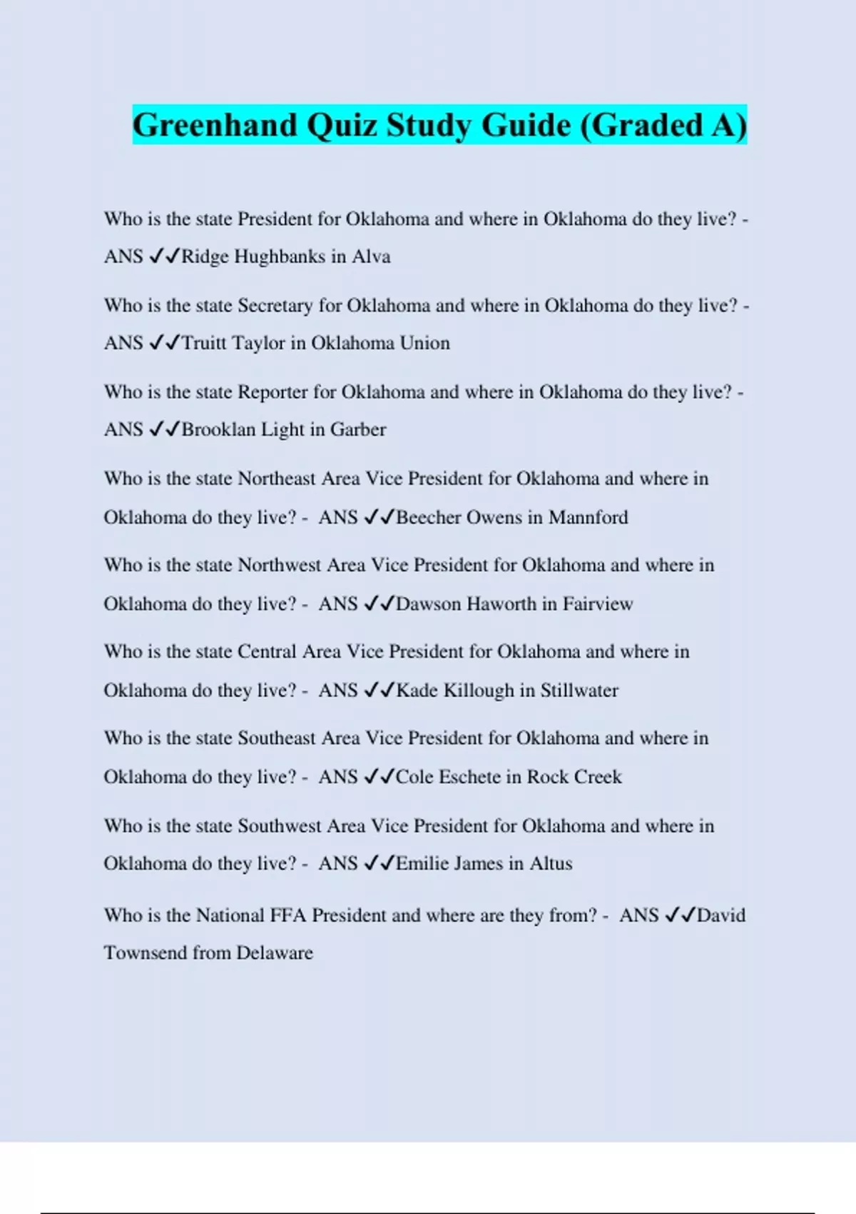 Greenhand Quiz Study Guide (Graded A) Who is the state President for Oklahoma and where in Oklahoma do they live? - ANS ️️ Ridge Hughbanks in Alva Who is the state Secretary for Oklahoma and where in Oklahoma do they live? - ANS ️️ Truitt Taylor in Oklahoma Union Who is the state Reporter for Oklahoma and where in Oklahoma do they live? - ANS ️️ Brooklan Light in Garber Who is the state Northeast Area Vice President for Oklahoma and where in Oklahoma do they live? - ANS ️️ Beecher Owens in Mannford Who is the state Northwest Area Vice President for Oklahoma and where in Oklahoma do they live? - ANS ️️ Dawson Haworth in Fairview Who is the state Central Area Vice President for Oklahoma and where in Oklahoma do they live? - ANS ️️ Kade Killough in Stillwater Who is the state Southeast Area Vice President for Oklahoma and where in Oklahoma do they live? - ANS ️️ Cole Eschete in Rock Creek Who is the state Southwest Area Vice President for Oklahoma and where in Oklahoma do they live? - ANS ️️ Emilie James in Altus Who is the National FFA President and where are they from? - ANS ️️ David Townsend from Delaware