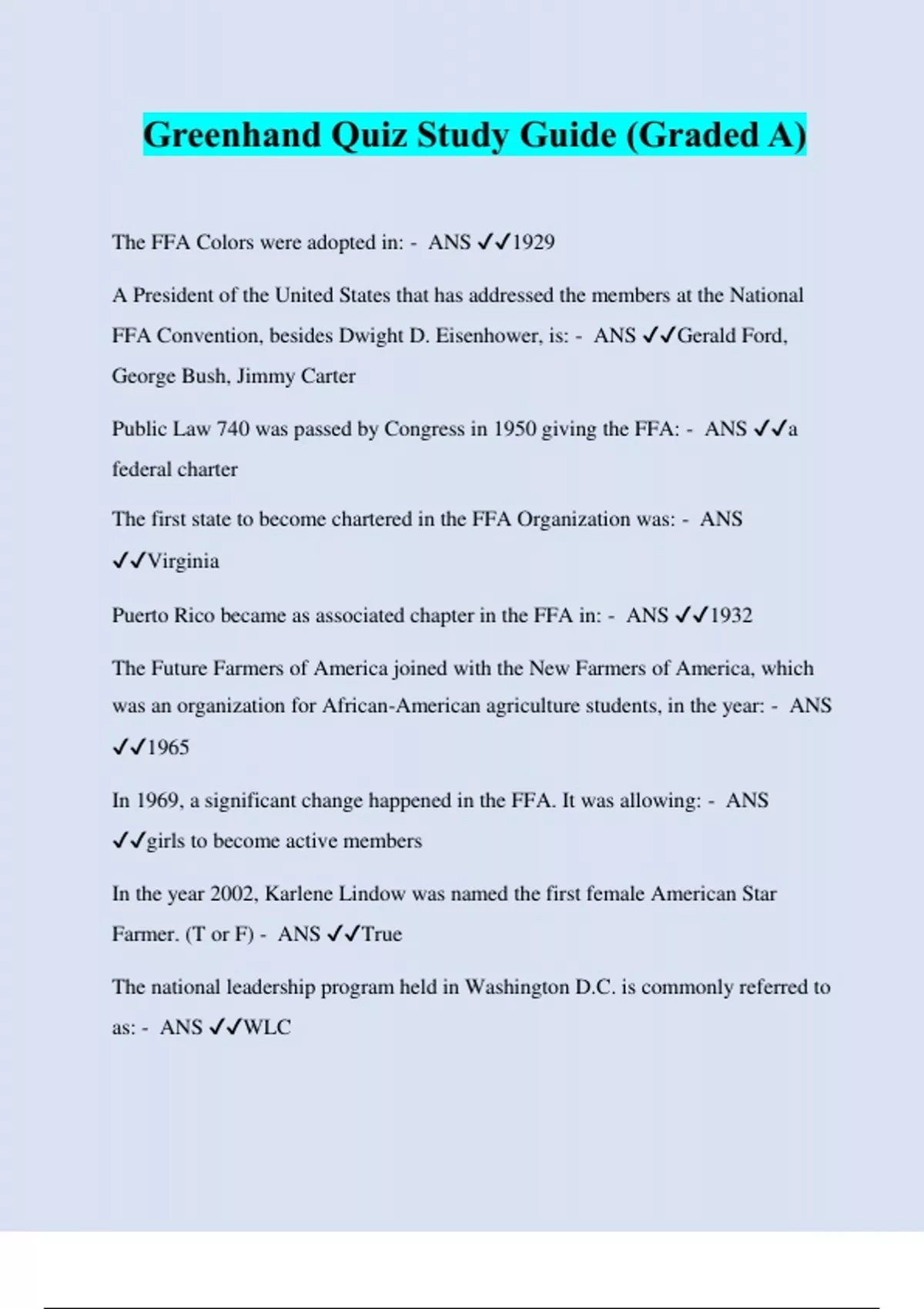 Greenhand Quiz Study Guide (Graded A) The FFA Colors were adopted in: - ANS ️️ 1929 A President of the United States that has addressed the members at the National FFA Convention, besides Dwight D. Eisenhower, is: - ANS ️️ Gerald Ford, George Bush, Jimmy Carter Public Law 740 was passed by Congress in 1950 giving the FFA: - ANS ️️ a federal charter The first state to become chartered in the FFA Organization was: - ANS ️️ Virginia Puerto Rico became as associated chapter in the FFA in: - ANS ️️ 1932 The Future Farmers of America joined with the New Farmers of America, which was an organization for African-American agriculture students, in the year: - ANS ️️ 1965 In 1969, a significant change happened in the FFA. It was allowing: - ANS ️️ girls to become active members In the year 2002, Karlene Lindow was named the first female American Star Farmer. (T or F) - ANS ️️ True The national leadership program held in Washington D.C. is commonly referred to as: - ANS ️️ WLC