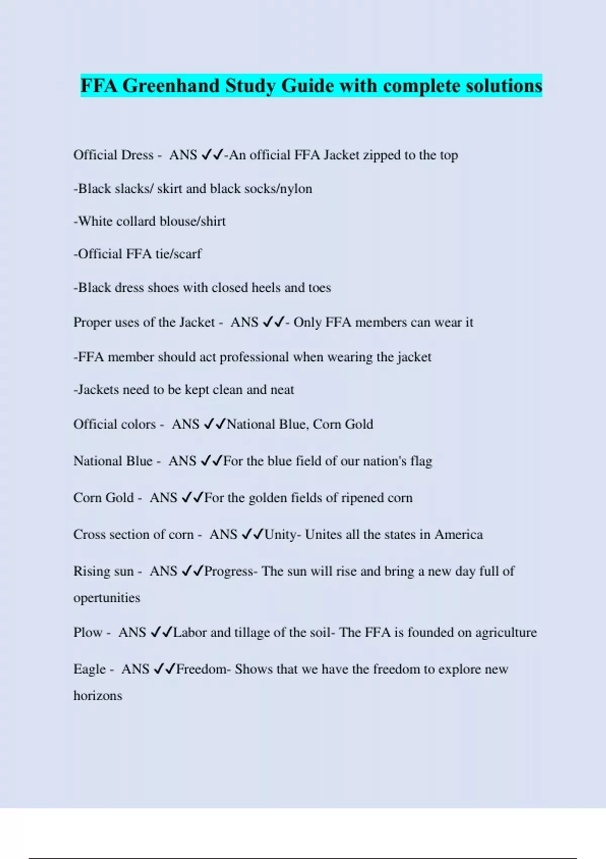FFA Greenhand Study Guide with complete solutions Official Dress - ANS ️️ -An official FFA Jacket zipped to the top -Black slacks/ skirt and black socks/nylon -White collard blouse/shirt -Official FFA tie/scarf -Black dress shoes with closed heels and toes Proper uses of the Jacket - ANS ️️ - Only FFA members can wear it -FFA member should act professional when wearing the jacket -Jackets need to be kept clean and neat Official colors - ANS ️️ National Blue, Corn Gold National Blue - ANS ️️ For the blue field of our nation's flag Corn Gold - ANS ️️ For the golden fields of ripened corn Cross section of corn - ANS ️️ Unity- Unites all the states in America Rising sun - ANS ️️ Progress- The sun will rise and bring a new day full of opertunities Plow - ANS ️️ Labor and tillage of the soil- The FFA is founded on agriculture Eagle - ANS ️️ Freedom- Shows that we have the freedom to explore new horizons Owl - ANS ️️ Knowledge- Shows the knowledge required to have a successful career in the Ag industry. Agricultural Ed and FFA - ANS ️️ Shows the combination of leadership and learning 1917 - ANS ️️ Smith-Hughes Act was pas