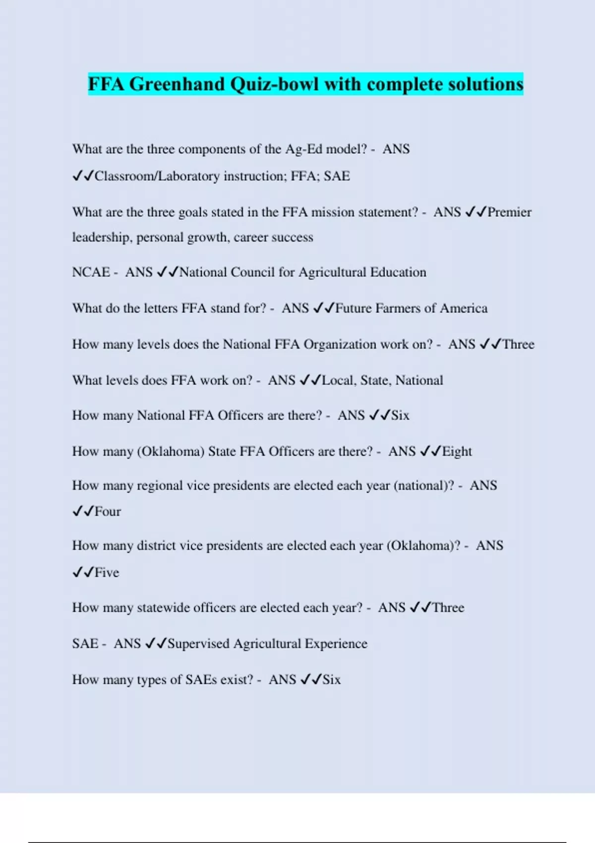 FFA Greenhand Quiz-bowl with complete solutions What are the three components of the Ag-Ed model? - ANS ️️ Classroom/Laboratory instruction; FFA; SAE What are the three goals stated in the FFA mission statement? - ANS ️️ Premier leadership, personal growth, career success NCAE - ANS ️️ National Council for Agricultural Education What do the letters FFA stand for? - ANS ️️ Future Farmers of America How many levels does the National FFA Organization work on? - ANS ️️ Three What levels does FFA work on? - ANS ️️ Local, State, National How many National FFA Officers are there? - ANS ️️ Six How many (Oklahoma) State FFA Officers are there? - ANS ️️ Eight How many regional vice presidents are elected each year (national)? - ANS ️️ Four How many district vice presidents are elected each year (Oklahoma)? - ANS ️️ Five How many statewide officers are elected each year? - ANS ️️ Three SAE - ANS ️️ Supervised Agricultural Experience How many types of SAEs exist? - ANS ️️ Six