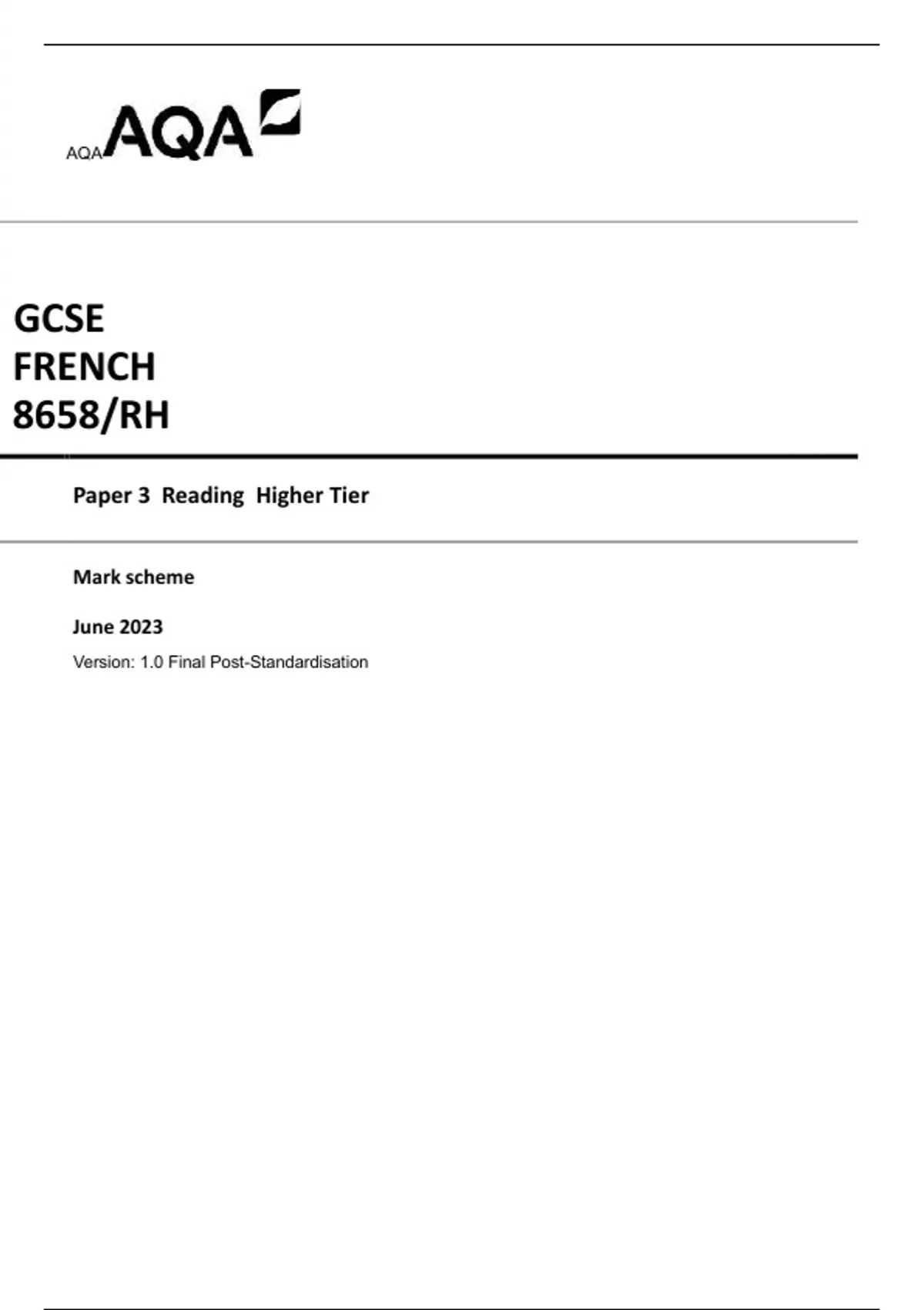 AQA GCSE FRENCH 8658/RH Paper 3 Reading Higher Tier Mark scheme June 2023 Version: 1.0 Final Post-Standardisation
