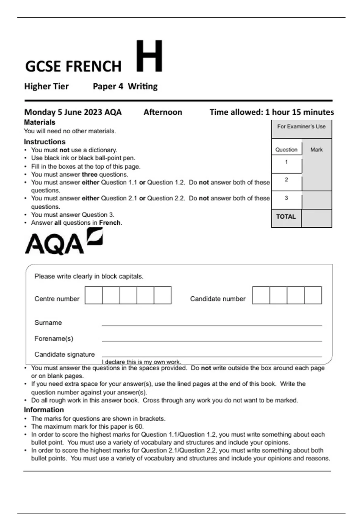 AQA GCSE FRENCH H Higher Tier Paper 4 Writing 8658-WH-QP-French-G-5Jun23