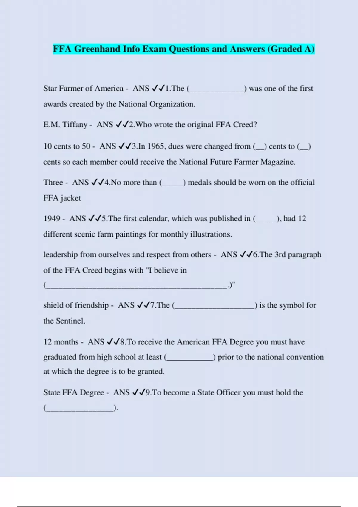 FFA Greenhand Info Exam Questions and Answers (Graded A) Star Farmer of America - ANS ️️ 1.The (_____________) was one of the first awards created by the National Organization. E.M. Tiffany - ANS ️️ 2.Who wrote the original FFA Creed? 10 cents to 50 - ANS ️️ 3.In 1965, dues were changed from (__) cents to (__) cents so each member could receive the National Future Farmer Magazine. Three - ANS ️️ 4.No more than (_____) medals should be worn on the official FFA jacket 1949 - ANS ️️ 5.The first calendar, which was published in (_____), had 12 different scenic farm paintings for monthly illustrations. leadership from ourselves and respect from others - ANS ️️ 6.The 3rd paragraph of the FFA Creed begins with "I believe in (___________________________________________.)" shield of friendship - ANS ️️ 7.The (___________________) is the symbol for the Sentinel. 12 months - ANS ️️ 8.To receive the American FFA Degree you must have graduated from high school at least (___________) prior to the national convention at which the degree is to be granted. State FFA Degree - ANS ️️ 9.To become a State Officer you must hold the (________________)