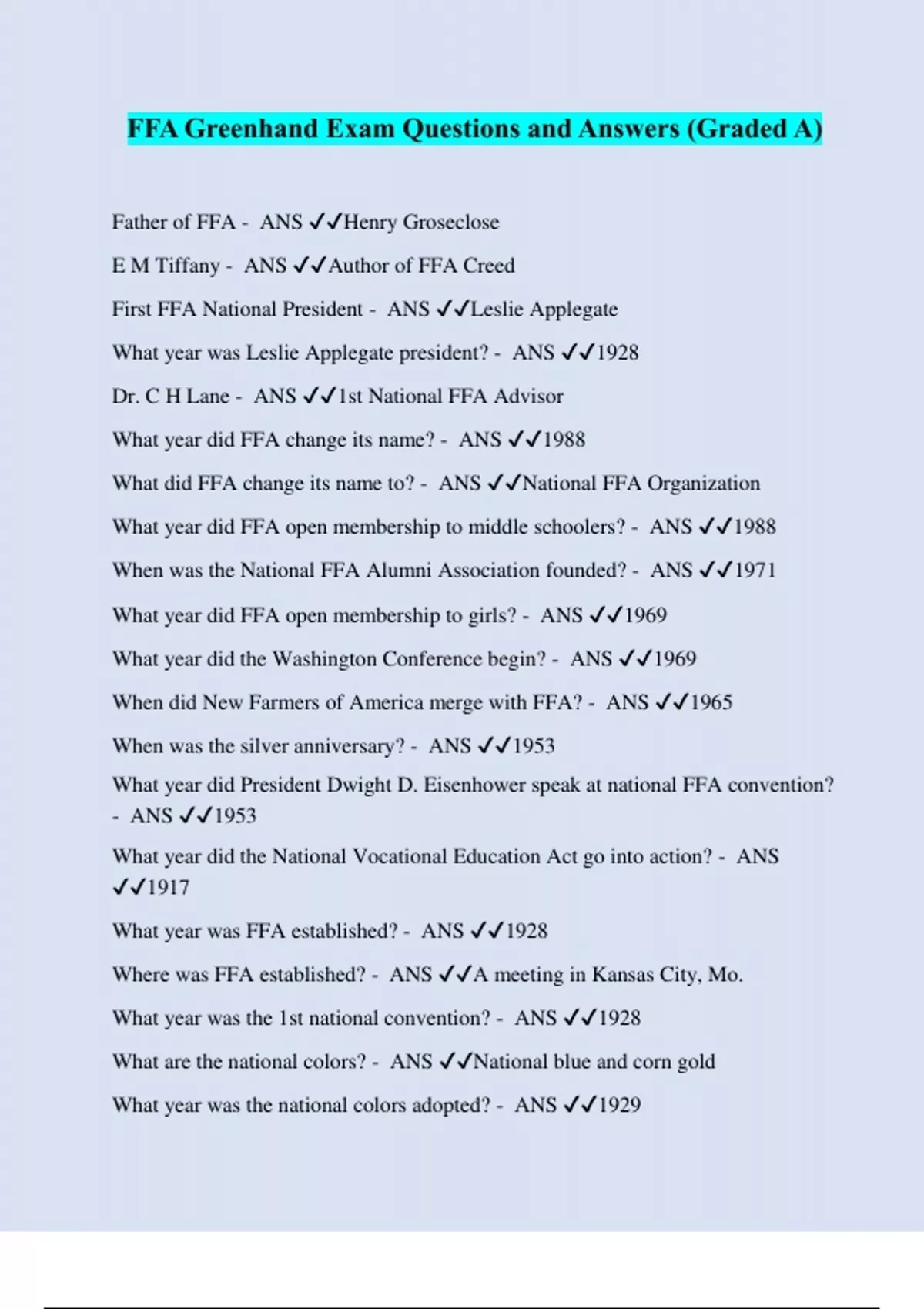 FFA Greenhand Exam Questions and Answers (Graded A) Father of FFA - ANS ️️ Henry Groseclose E M Tiffany - ANS ️️ Author of FFA Creed First FFA National President - ANS ️️ Leslie Applegate What year was Leslie Applegate president? - ANS ️️ 1928 Dr. C H Lane - ANS ️️ 1st National FFA Advisor What year did FFA change its name? - ANS ️️ 1988 What did FFA change its name to? - ANS ️️ National FFA Organization What year did FFA open membership to middle schoolers? - ANS ️️ 1988 When was the National FFA Alumni Association founded? - ANS ️️ 1971 What year did FFA open membership to girls? - ANS ️️ 1969 What year did the Washington Conference begin? - ANS ️️ 1969 When did New Farmers of America merge with FFA? - ANS ️️ 1965 When was the silver anniversary? - ANS ️️ 1953 What year did President Dwight D. Eisenhower speak at national FFA convention? - ANS ️️ 1953 What year did the National Vocational Education Act go into action? - ANS ️️ 1917 What year was FFA established? - ANS ️️ 1928 Where was FFA established? - ANS ️️ A meeting in Kansas City, Mo. What year was the 1st national convention? - ANS ️️ 1928 What are the national colors? - ANS ️️ National blue and corn gold What year was the national colors adopted? - ANS ️️ 1929
