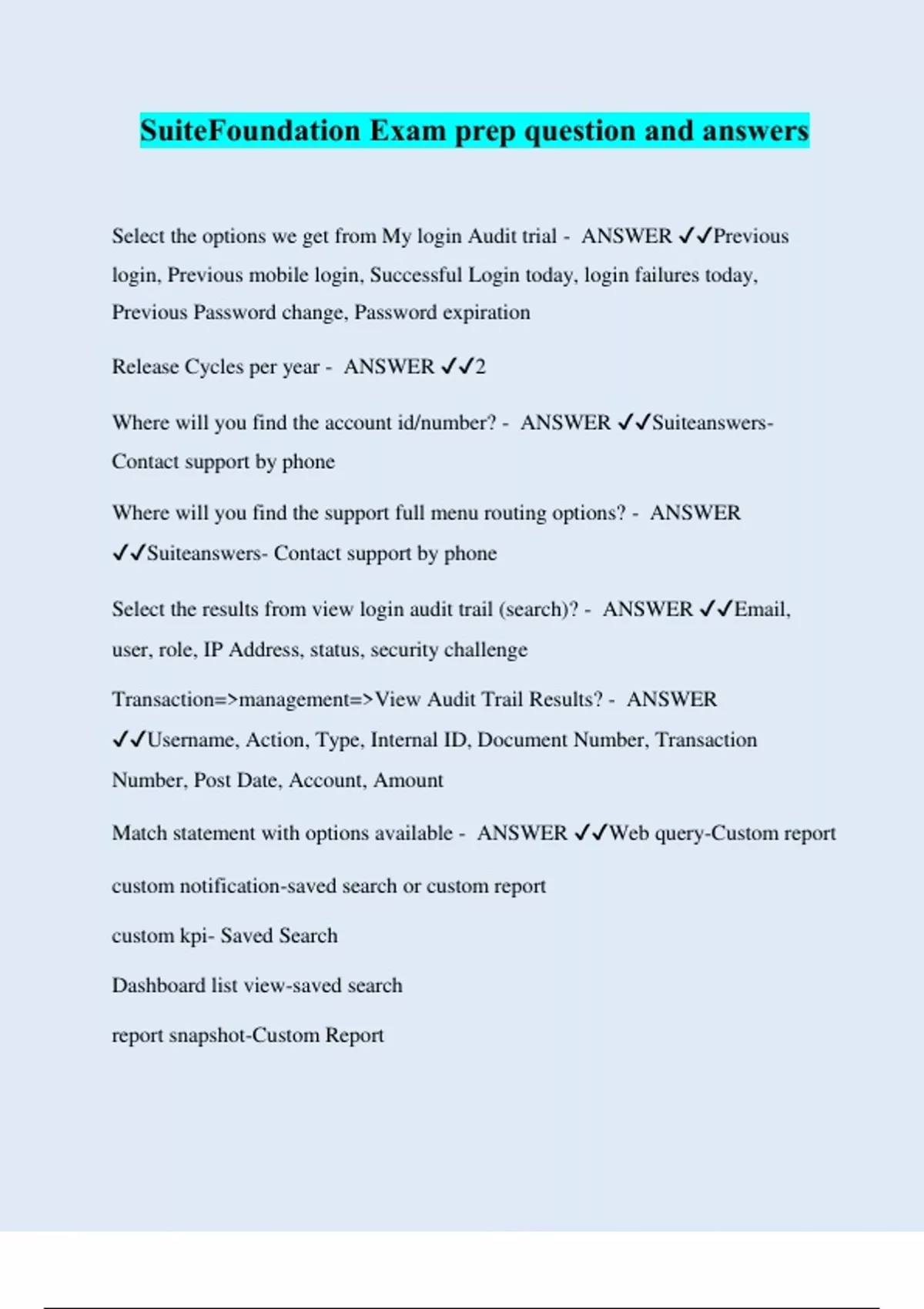 SuiteFoundation Exam prep question and answers Select the options we get from My login Audit trial - ANSWER ️️ Previous login, Previous mobile login, Successful Login today, login failures today, Previous Password change, Password expiration Release Cycles per year - ANSWER ️️ 2 Where will you find the account id/number? - ANSWER ️️ Suiteanswers- Contact support by phone Where will you find the support full menu routing options? - ANSWER ️️ Suiteanswers- Contact support by phone Select the results from view login audit trail (search)? - ANSWER ️️ Email, user, role, IP Address, status, security challenge Transaction=>management=>View Audit Trail Results? - ANSWER ️️ Username, Action, Type, Internal ID, Document Number, Transaction Number, Post Date, Account, Amount Match statement with options available - ANSWER ️️ Web query-Custom report custom notification-saved search or custom report custom kpi- Saved Search Dashboard list view-saved search report snapshot-Custom Report