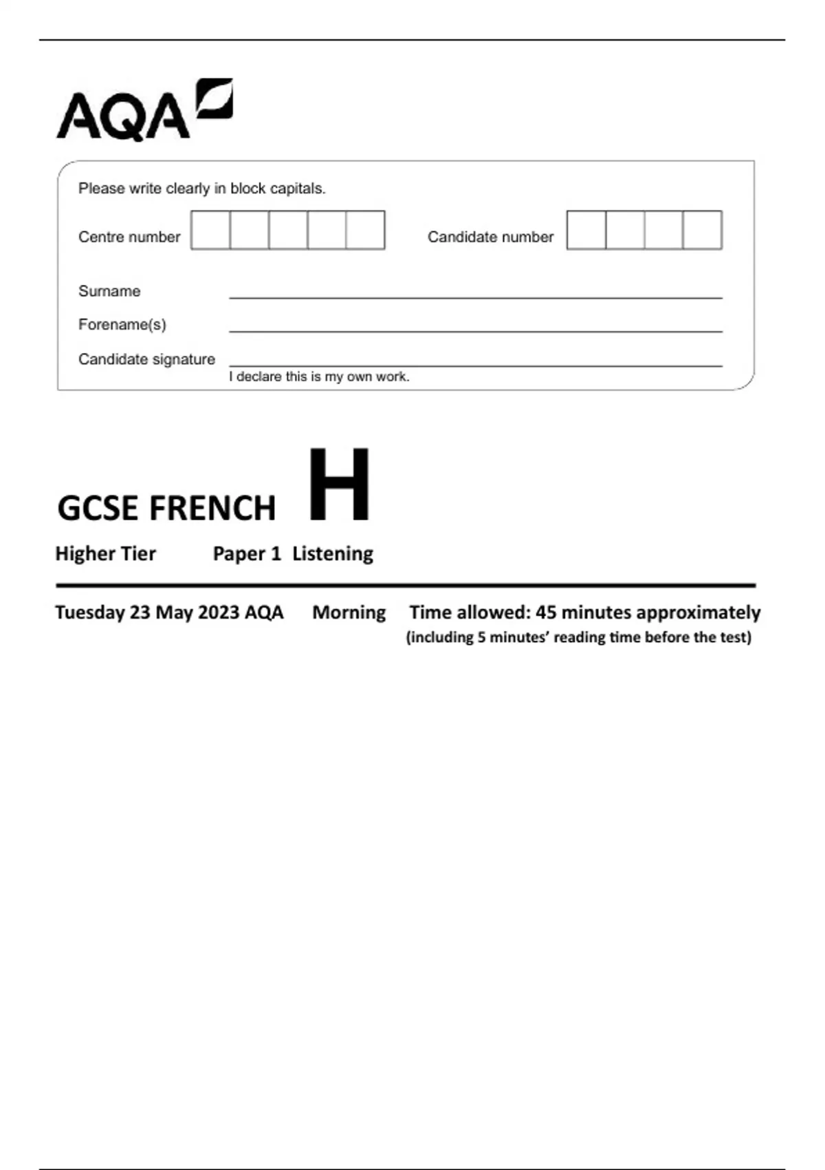 AQA GCSE FRENCH H Higher Tier Paper 1 Listening 8658-LH-QP-French-G-23May23