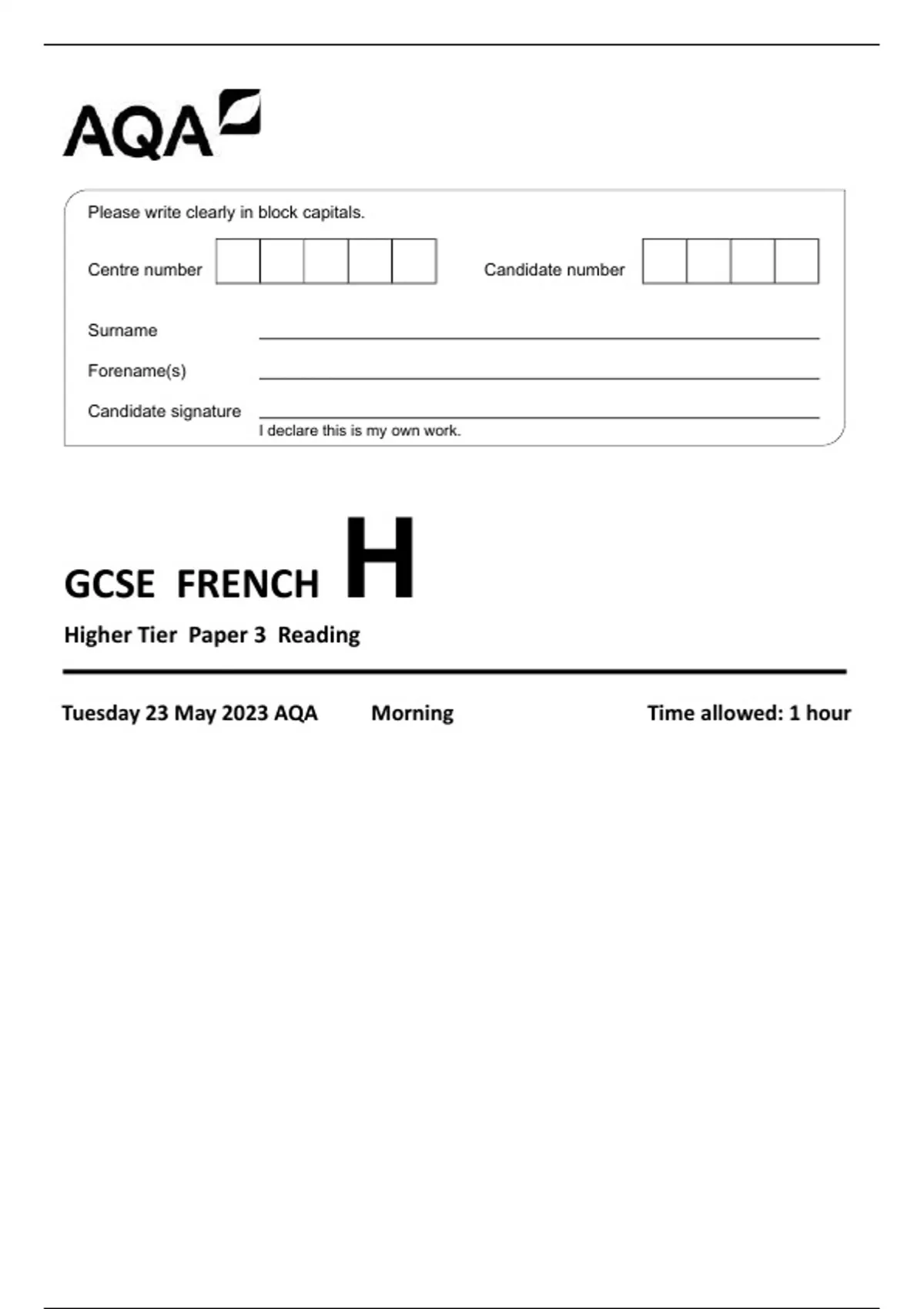 AQA GCSE FRENCH H Higher Tier Paper 3 Reading 8658-RHR-QP-French-G-23May23