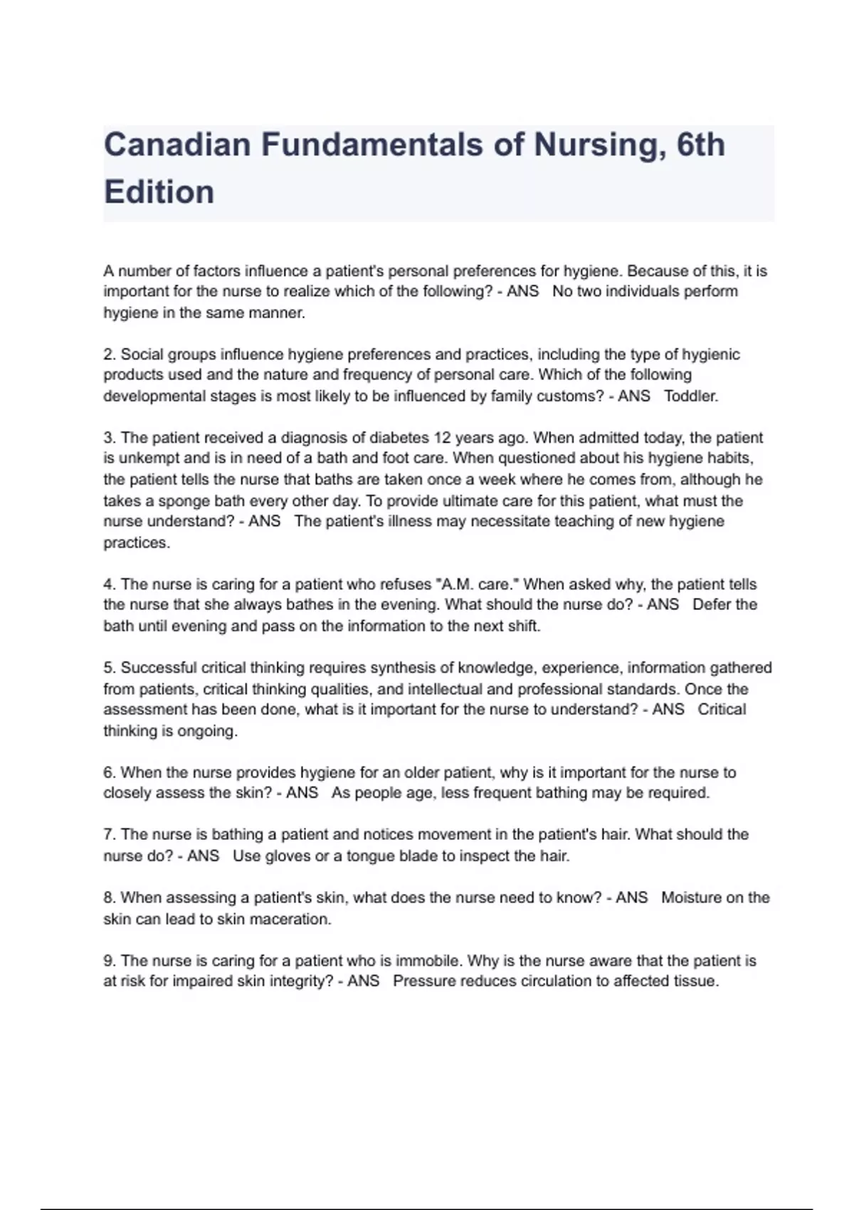 Canadian Fundamentals of Nursing, 6th Edition A number of factors influence a patient's personal preferences for hygiene. Because of this, it is important for the nurse to realize which of the following? - ANS No two individuals perform hygiene in the same manner. 2. Social groups influence hygiene preferences and practices, including the type of hygienic products used and the nature and frequency of personal care. Which of the following developmental stages is most likely to be influenced by family customs? - ANS Toddler. 3. The patient received a diagnosis of diabetes 12 years ago. When admitted today, the patient is unkempt and is in need of a bath and foot care. When questioned about his hygiene habits, the patient tells the nurse that baths are taken once a week where he comes from, although he takes a sponge bath every other day. To provide ultimate care for this patient, what must the nurse understand? - ANS The patient's illness may necessitate teaching of new hygiene practices. 4. The nurse is caring for a patient who refuses "A.M. care." When asked why, the patient tells the nurse that she always bathes in the evening. What should the nurse do? - ANS Defer the bath until evening and pass on the information to the next shift. 5. Successful critical thinking requires synthesis of knowledge, experience, information gathered from patients, critical thinking qualities, and intellectual and professional standards. Once the assessment has been done, what is it important for the nurse to understand? - ANS Critical thinking is ongoing. 6. When the nurse provides hygiene for an older patient, why is it important for the nurse to closely assess the skin? - ANS As people age, less frequent bathing may be required. 7. The nurse is bathing a patient and notices movement in the patient's hair. What should the nurse do? - ANS Use gloves or a tongue blade to inspect the hair. 8. When assessing a patient's skin, what does the nurse need to know? - ANS Moisture on the skin can lead to skin maceration. 9. The nurse is caring for a patient who is immobile. Why is the nurse aware that the patient is at risk for impaired skin integrity? - ANS Pressure reduces circulation to affected tissue. 10. The nurse is caring for a patient who has diabetes mellitus, circulatory insufficiency, peripheral neuropathy, and urinary incontinence. What does the nurse know about patients with these conditions? - ANS They have decreased pain sensation and are at increased risk of skin impairment. 11. The nurse is caring for a patient who has undergone external fixation of a broken leg and has a cast in place. To prevent skin impairment, what should the nurse do? - ANS Assess all surfaces exposed to the cast for pressure areas. 12. Of the following interventions, which would be the most important for preventing skin impairment in a mobile patient with local nerve damage? - ANS During a bath, assess for pain. 13. Of the following disorders, which is caused by a virus? - ANS Plantar warts. 14. The nurse is caring for a patient who is complaining of severe foot pain caused by corns. The patient states that she has been using oval corn pads to self-treat the corns, but they seem to be getting worse. What does the nurse explain? - ANS Depending on severity, surgery may be needed to remove the corns. 15. The patient receives a diagnosis of athlete's foot (tinea pedis). The patient says that she is relieved because it is "only athlete's foot" and it can be treated easily. What does the nurse explain about athlete's foot? - ANS It is contagious and frequently recurs. 16. When assessing a patient's feet, the nurse notices that the toenails are thick and separated from the nail bed. What causes this condition? - ANS Fungi 17. The nurse is providing education about proper foot care to a patient who has diabetes mellitus. Why is this important? - ANS Foot ulcers are the most common precursor to amputation. 18. The nurse is providing oral care to an unconscious patient and notes that the patient has extremely bad breath. What is the term for "bad breath"? - ANS Halitosis. 19. The nurse is caring for an unresponsive patient who has a nasogastric tube in place for continuous tube feedings. Why does the nurse assess the patient's oral hygiene? - ANS Oral hygiene helps prevent gingivitis. 20. The patient is being treated for cancer with weekly radiation and chemotherapy treatments. The nurse is aware that the patient's oral mucosa needs to be assessed because radiation therapy and chemotherapy can have what effects? - ANS Increase in likelihood of oral problems. 21. In providing oral care to an unconscious patient, what is an important action by the nurse? - ANS Rinsing the mouth and immediately suctioning the oral cavity. 22. The nurse is teaching the patient about flossing and oral hygiene. Which of the following is the nurse's instruction? - ANS Flossing removes plaque and bacteria from the teeth. 23. The nurse is caring for a patient who has head lice (pediculosis capitis). What should the nurse know about treating this condition? - ANS Head lice may spread to furniture and other people. 24. Scaling of the scalp accompanied by itching is known as which of the following? - ANS Dandruff 25. In finding pediculosis capitis (head lice) in a patient, what would the nurse expect to observe? - ANS Pustules or bites behind ears and at the hairline. 26. The nurse is caring for a patient who has multiple ticks on her legs and body. To rid the patient of ticks, what should the nurse do? - ANS Use blunt tweezers and pull upward with steady pressure. 27. The patient received a diagnosis of pediculosis capitis (head lice), was treated upon admission, and was re-treated 24 hours later, and yet the patient is still has an infestation. What should be the nurse's next action? - ANS Manually remove the lice using a fine-toothed comb. 28. The nurse is caring for an older patient with Alzheimer's disease who is ambulatory but requires total assistance with