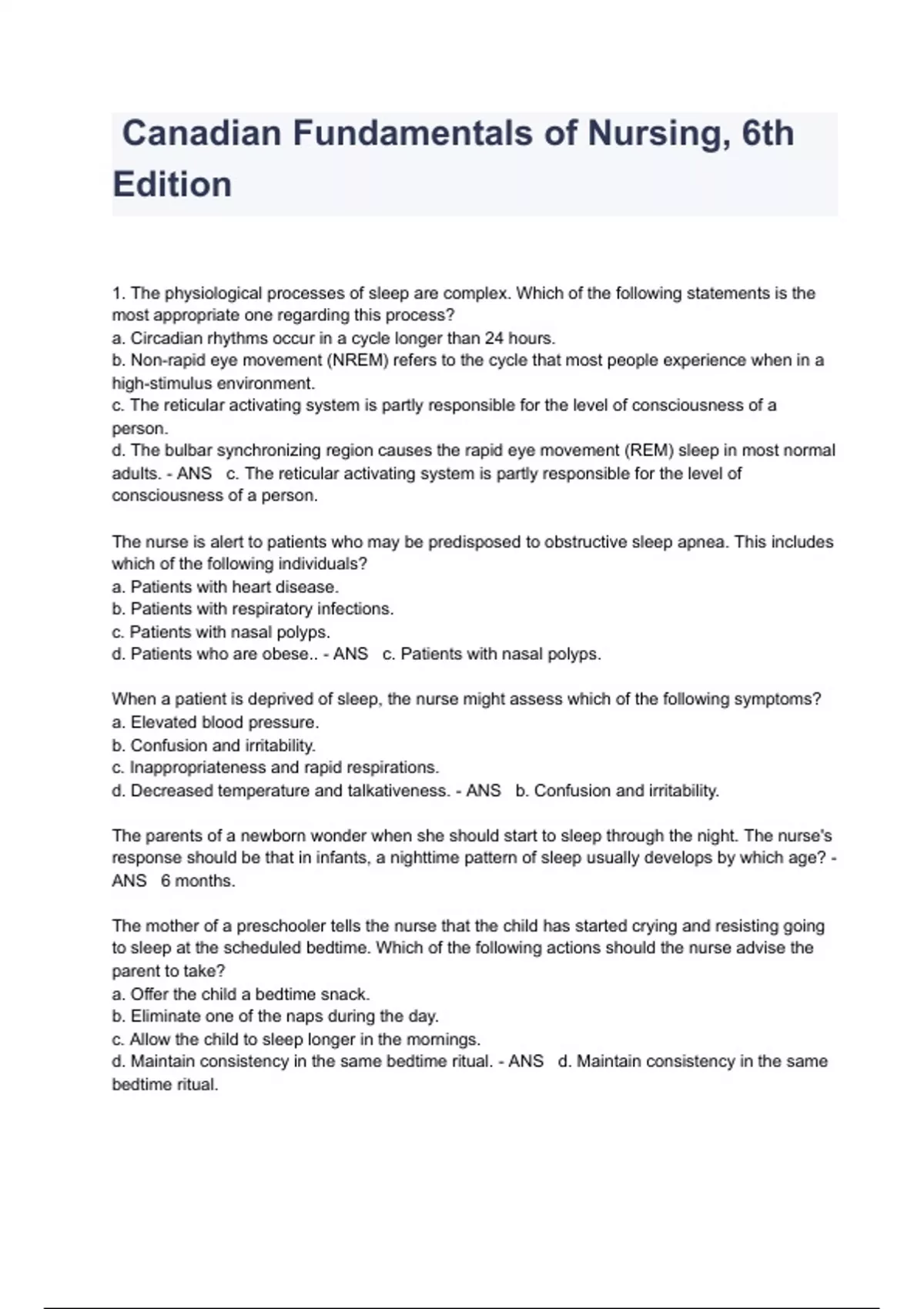 Canadian Fundamentals of Nursing, 6th Edition 1. The physiological processes of sleep are complex. Which of the following statements is the most appropriate one regarding this process? a. Circadian rhythms occur in a cycle longer than 24 hours. b. Non-rapid eye movement (NREM) refers to the cycle that most people experience when in a high-stimulus environment. c. The reticular activating system is partly responsible for the level of consciousness of a person. d. The bulbar synchronizing region causes the rapid eye movement (REM) sleep in most normal adults. - ANS c. The reticular activating system is partly responsible for the level of consciousness of a person. The nurse is alert to patients who may be predisposed to obstructive sleep apnea. This includes which of the following individuals? a. Patients with heart disease. b. Patients with respiratory infections. c. Patients with nasal polyps. d. Patients who are obese.. - ANS c. Patients with nasal polyps. When a patient is deprived of sleep, the nurse might assess which of the following symptoms? a. Elevated blood pressure. b. Confusion and irritability. c. Inappropriateness and rapid respirations. d. Decreased temperature and talkativeness. - ANS b. Confusion and irritability. The parents of a newborn wonder when she should start to sleep through the night. The nurse's response should be that in infants, a nighttime pattern of sleep usually develops by which age? - ANS 6 months. The mother of a preschooler tells the nurse that the child has started crying and resisting going to sleep at the scheduled bedtime. Which of the following actions should the nurse advise the parent to take? a. Offer the child a bedtime snack. b. Eliminate one of the naps during the day. c. Allow the child to sleep longer in the mornings. d. Maintain consistency in the same bedtime ritual. - ANS d. Maintain consistency in the same bedtime ritual. An 11-year-old child in middle school is currently experiencing fatigue related to sleep deprivation during classes. Which of the following responses by the school nurse is the most appropriate one when counselling the child's parents regarding this assessment? - ANS "What are the child's usual sleep patterns?" In describing the sleep patterns of older persons, the nurse recognizes that which of the following statements is true? - ANS Older persons have a decline in slow-wave or deep sleep. A patient who is currently taking a diuretic should be informed by the nurse that he or she may experience which of the following effects? - ANS Nocturia 9. As a result of recent studies regarding infant safety during sleep, which of the following instructions does the nurse give the parents? - ANS Place the infant on his or her back. A 74-year-old patient reports having sleeping difficulties. To have a better idea of the patient's problem, how should the nurse respond? - ANS "What do you do just before going to bed?" Which of the following information provided by the patient's bed partner is most associated with sleep apnea? a. Restlessness. b. Talking during sleep. c. Sleepwalking. d. Excessive snoring. - ANS d. Excessive snoring. 12. Which of the following instructions does the nurse give the patient in teaching methods to promote positive sleep habits at home? - ANS Use the bedroom only for sleep or sexual activity. 13. The nurse is discussing sleep habits with the patient in the sleep assessment clinic. Of the following activities performed before sleeping, the nurse informs the patient that which one of the following can potentially interfere with the patient's sleep? - ANS Finishing office work. The patient needs pharmacological treatment to assist with his sleep patterns. The nurse anticipates that treatment with an anxiety-reducing, relaxation-promoting medication will include the use of which one of the following? a. Barbiturates. b. Amphetamines. c. Benzodiazepines. d. Tricyclic antidepressants. - ANS c. Benzodiazepines. 15. The nurse is completing an assessment of the patient's sleep patterns. Which of the following is a specific question that the nurse should ask to determine the potential presence of sleep apnea? a. "How easily do you fall asleep?" b. "Do you have vivid, lifelike dreams?" c. "Do you ever experience loss of muscle control or falling?" d. "Do you snore loudly or experience headaches?" - ANS d. "Do you snore loudly or experience headaches?" 16. Which of the following is an effective brief method for assessing sleep quality? - ANS Visual analogue scale. 17. Which sleep stage begins the initial period of deep sleep? - ANS Stage 3. 18. Which stage of sleep accounts for the greatest proportion of total sleep time in adults? - ANS Stage 2. 19. Which of the following is a determinant of dreams? - ANS Age 20. Which of the following sleep disorders is a parasomnia disorder of arousal? - ANS Sleepwalking. The nurse is gathering a sleep history from a patient who is being evaluated for obstructive sleep apnea (OSA). Which common symptom is the patient most likely to report? - ANS Excessive daytime sleepiness The nurse incorporates which priority nursing intervention into a plan of care to promote sleep for a hospitalized patient? - ANS Avoid awakening the patient for nonessential tasks. Older persons are cautioned about the use of nonprescription sleeping medications for which following reason? - ANS These medications lead to further sleep disruption even when they initially seemed to be effective. The patient reports having vivid dreams to the nurse. As a result of understanding the sleep cycle, the nurse recognizes that vivid dreaming occurs in which sleep phase? - ANS Rapid-eye-movement (REM) sleep The nurse teaches a patient taking phenytoin (Dilantin), an anticonvulsant, that it is one of a group of medications that cause which symptom of a sleep problem? - ANS Increased daytime sleepiness. Which intervention is appropriate to include on a care plan for improving sleep in the older adult? - ANS Decrease fluid