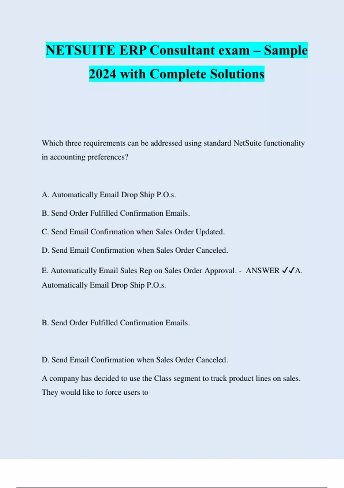 NETSUITE ERP Consultant exam – Sample 2024 with Complete Solutions Which three requirements can be addressed using standard NetSuite functionality in accounting preferences? A. Automatically Email Drop Ship P.O.s. B. Send Order Fulfilled Confirmation Emails. C. Send Email Confirmation when Sales Order Updated. D. Send Email Confirmation when Sales Order Canceled. E. Automatically Email Sales Rep on Sales Order Approval. - ANSWER ️️ A. Automatically Email Drop Ship P.O.s. B. Send Order Fulfilled Confirmation Emails. D. Send Email Confirmation when Sales Order Canceled. A company has decided to use the Class segment to track product lines on sales. They would like to force users to enter a value in this field and have configured the system to show the class field at the line level of transactions. Which two configurations are required to meet these requirements? A. Set a default value based on the Class of the current user. B. Enable the accounting preference Make Classes Mandatory. C. Disable the accounting preference Make Classes Mandatory. D. Create a dummy value called "No Class" to select on transactions where a product line is not applicable. - ANSWER ️️ B. Enable the accounting preference Make Classes Mandatory. D. Create a dummy value called "No Class" to select on transactions where a product line is not applicable. Which action is recommended for undesired accounts in preparing for go-live? A. Leave undesired accounts active to avoid disabling features. B. Leave undesired accounts active in case transactions post to them. C. Inactivate undesired accounts to remove them from searches and reports. D. Inactivate undesired accounts to prevent transactions from posting to them - ANSWER ️️ B. Leave undesired accounts active in case transactions post to them