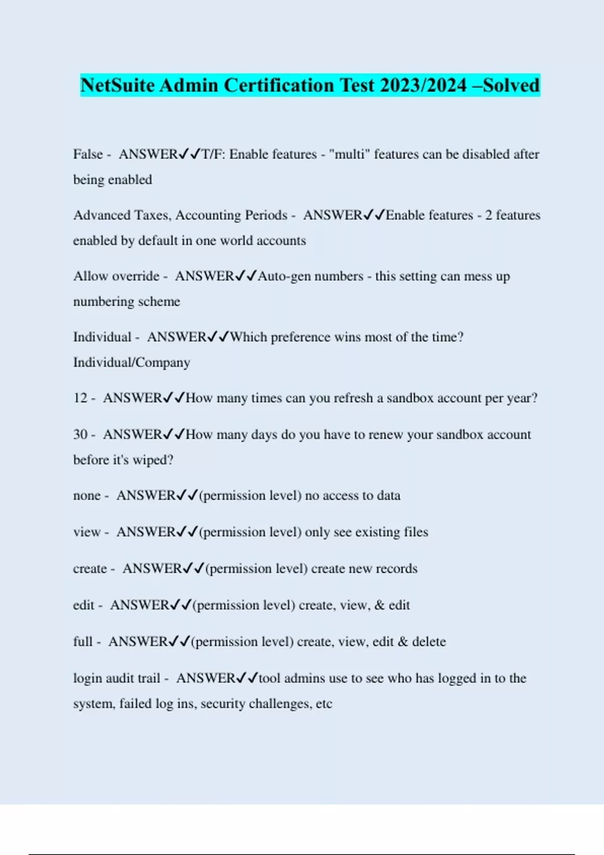 NetSuite Admin Certification Test 2023/2024 –Solved False - ANSWER️️ T/F: Enable features - "multi" features can be disabled after being enabled Advanced Taxes, Accounting Periods - ANSWER️️ Enable features - 2 features enabled by default in one world accounts Allow override - ANSWER️️ Auto-gen numbers - this setting can mess up numbering scheme Individual - ANSWER️️ Which preference wins most of the time? Individual/Company 12 - ANSWER️️ How many times can you refresh a sandbox account per year? 30 - ANSWER️️ How many days do you have to renew your sandbox account before it's wiped? none - ANSWER️️ (permission level) no access to data view - ANSWER️️ (permission level) only see existing files create - ANSWER️️ (permission level) create new records edit - ANSWER️️ (permission level) create, view, & edit full - ANSWER️️ (permission level) create, view, edit & delete login audit trail - ANSWER️️ tool admins use to see who has logged in to the system, failed log ins, security challenges, etc