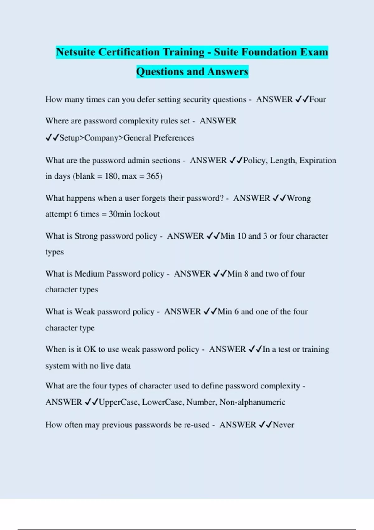 Netsuite Certification Training - Suite Foundation Exam Questions and Answers How many times can you defer setting security questions - ANSWER ️️ Four Where are password complexity rules set - ANSWER ️️ Setup>Company>General Preferences What are the password admin sections - ANSWER ️️ Policy, Length, Expiration in days (blank = 180, max = 365) What happens when a user forgets their password? - ANSWER ️️ Wrong attempt 6 times = 30min lockout What is Strong password policy - ANSWER ️️ Min 10 and 3 or four character types What is Medium Password policy - ANSWER ️️ Min 8 and two of four character types What is Weak password policy - ANSWER ️️ Min 6 and one of the four character type When is it OK to use weak password policy - ANSWER ️️ In a test or training system with no live data What are the four types of character used to define password complexity - ANSWER ️️ UpperCase, LowerCase, Number, Non-alphanumeric How often may previous passwords be re-used - ANSWER ️️ Never