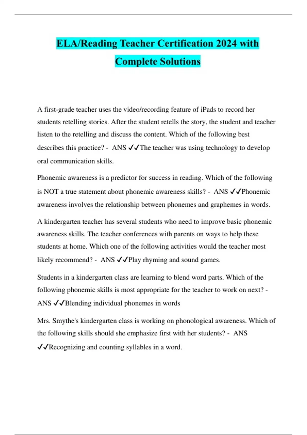 ELA/Reading Teacher Certification 2024 with Complete Solutions A first-grade teacher uses the video/recording feature of iPads to record her students retelling stories. After the student retells the story, the student and teacher listen to the retelling and discuss the content. Which of the following best describes this practice? - ANS ️️ The teacher was using technology to develop oral communication skills. Phonemic awareness is a predictor for success in reading. Which of the following is NOT a true statement about phonemic awareness skills? - ANS ️️ Phonemic awareness involves the relationship between phonemes and graphemes in words. A kindergarten teacher has several students who need to improve basic phonemic awareness skills. The teacher conferences with parents on ways to help these students at home. Which one of the following activities would the teacher most likely recommend? - ANS ️️ Play rhyming and sound games. Students in a kindergarten class are learning to blend word parts. Which of the following phonemic skills is most appropriate for the teacher to work on next? - ANS ️️ Blending individual phonemes in words Mrs. Smythe's kindergarten class is working on phonological awareness. Which of the following skills should she emphasize first with her students? - ANS ️️ Recognizing and counting syllables in a word. A kindergarten class is learning about the letter m. The teacher plans homework around this focus. Which of the following activities best reinforces student knowledge of the alphabetic principle? - ANS ️️ The teacher has students cut out and label objects which begin with the letter m. Several English language learners in Mrs. Night's 1st grade class are having a particular difficulty with sight words. Sight words are most likely difficult for these students because — - ANS ️️ they are irregular words which are difficult to decode using graphophonemic knowledge. A second-grade teacher points to the word 'grain' on the board, underlines the letters 'ai' in the middle of the word, and pronounces the word /grraaan/, emphasizing the long 'a' sound. She explains to the class that when two vowels appear between two consonants, readers should pronounce the long vowel sound in the first vowel. Then she repeats the steps with other similar words providing multiple opportunities for students to practice. Which of the following concepts is the teacher primarily addressing? - ANS ️️ Alphabetic princi