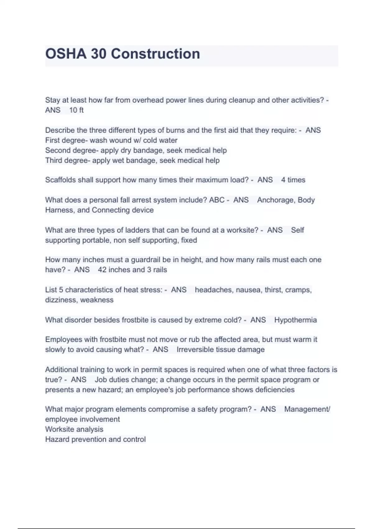 OSHA 30 Construction Questions And Answers Stay at least how far from overhead power lines during cleanup and other activities? - ANS 10 ft Describe the three different types of burns and the first aid that they require: - ANS First degree- wash wound w/ cold water Second degree- apply dry bandage, seek medical help Third degree- apply wet bandage, seek medical help Scaffolds shall support how many times their maximum load? - ANS 4 times What does a personal fall arrest system include? ABC - ANS Anchorage, Body Harness, and Connecting device What are three types of ladders that can be found at a worksite? - ANS Self supporting portable, non self supporting, fixed How many inches must a guardrail be in height, and how many rails must each one have? - ANS 42 inches and 3 rails List 5 characteristics of heat stress: - ANS headaches, nausea, thirst, cramps, dizziness, weakness What disorder besides frostbite is caused by extreme cold? - ANS Hypothermia Employees with frostbite must not move or rub the affected area, but must warm it slowly to avoid causing what? - ANS Irreversible tissue damage Additional training to work in permit spaces is required when one of what three factors is true? - ANS Job duties change; a change occurs in the permit space program or presents a new hazard; an employee's job performance shows deficiencies What major program elements compromise a safety program? - ANS Management/ employee involvement Worksite analysis Hazard prevention and control