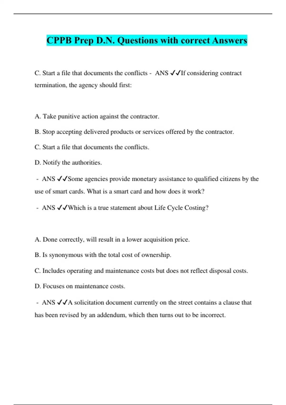 CPPB Prep D.N. Questions with correct Answers C. Start a file that documents the conflicts - ANS ️️ If considering contract termination, the agency should first: A. Take punitive action against the contractor. B. Stop accepting delivered products or services offered by the contractor. C. Start a file that documents the conflicts. D. Notify the authorities. - ANS ️️ Some agencies provide monetary assistance to qualified citizens by the use of smart cards. What is a smart card and how does it work? - ANS ️️ Which is a true statement about Life Cycle Costing? A. Done correctly, will result in a lower acquisition price. B. Is synonymous with the total cost of ownership. C. Includes operating and maintenance costs but does not reflect disposal costs. D. Focuses on maintenance costs. - ANS ️️ A solicitation document currently on the street contains a clause that has been revised by an addendum, which then turns out to be incorrect. What happens if the bid opening date hasn't occurred yet? What happens if the bids have not been opened? Minor irregularites - ANS ️️ Failure of a bidder to return the number of signed copies requested, failure of a bidder to acknowledge receipt of an addendum or failure to execute a required certificate are often considered: A. Deal-breakers B. Responsiveness issues C. Minor irregularities D. Major irregularities Making sure that the pricing has not changed. - ANS ️️ You've opened some bids and identified the lowest responsive/responsible bidder. However, due to internal issues in the using department, several months have passed without the award being made. Before pressing on, what action, if any, should be taken with the low bidder